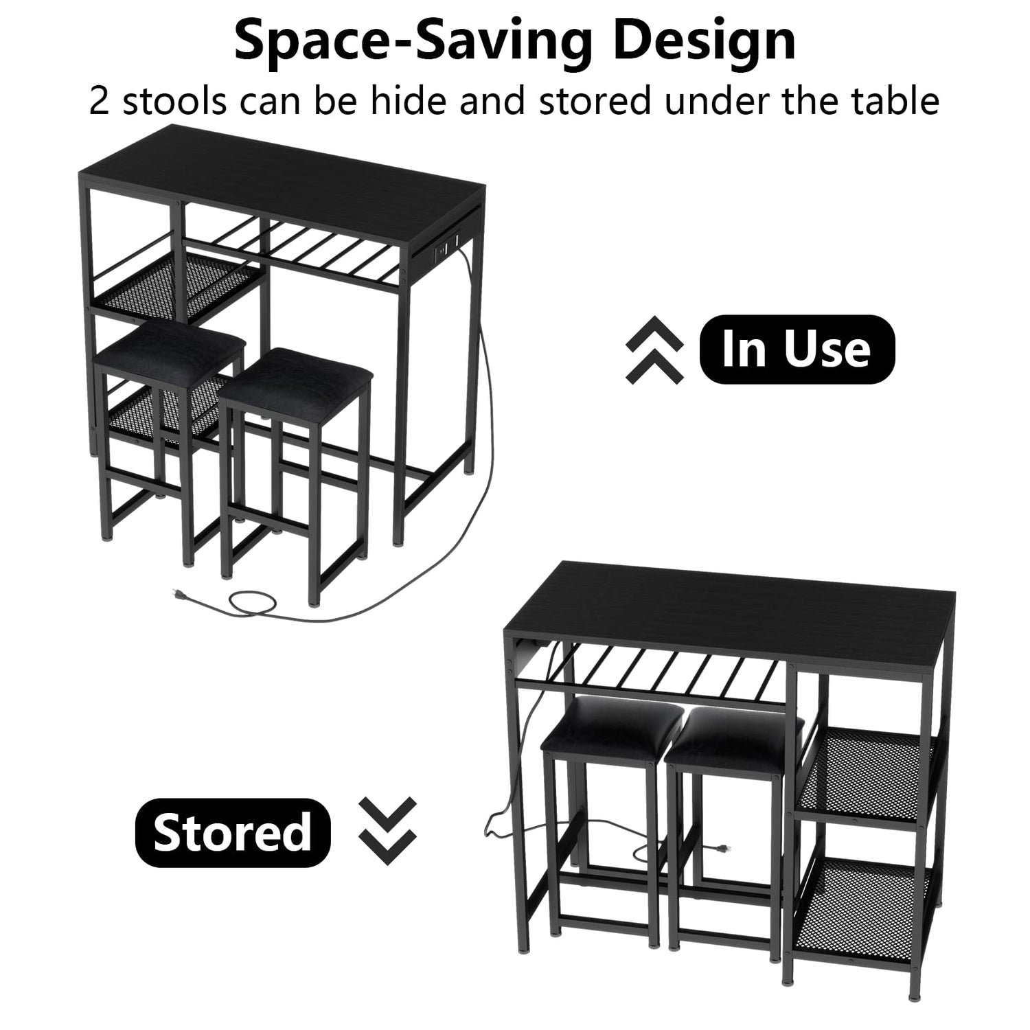 Gyfimoie Bar Table and Chairs Set with Power Outlet, Pub Table and Chairs Set for 2 with 2 Storage Shelves, 3 Piece Table Set with Wine Rack&Glass Holder for Living Room,Dining Room,Small Apt (Black)