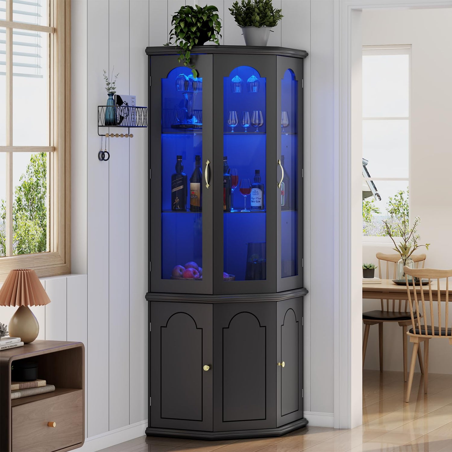 Gyfimoie Corner Bar Cabinet w/LED Lights, Tall Modern Wine Cabinet with Tempered Glass Door & Adjustable Shelves, Home Bar Liquor Storage Cabinet with Glass Rack for Living Room, Dining Room (Black)