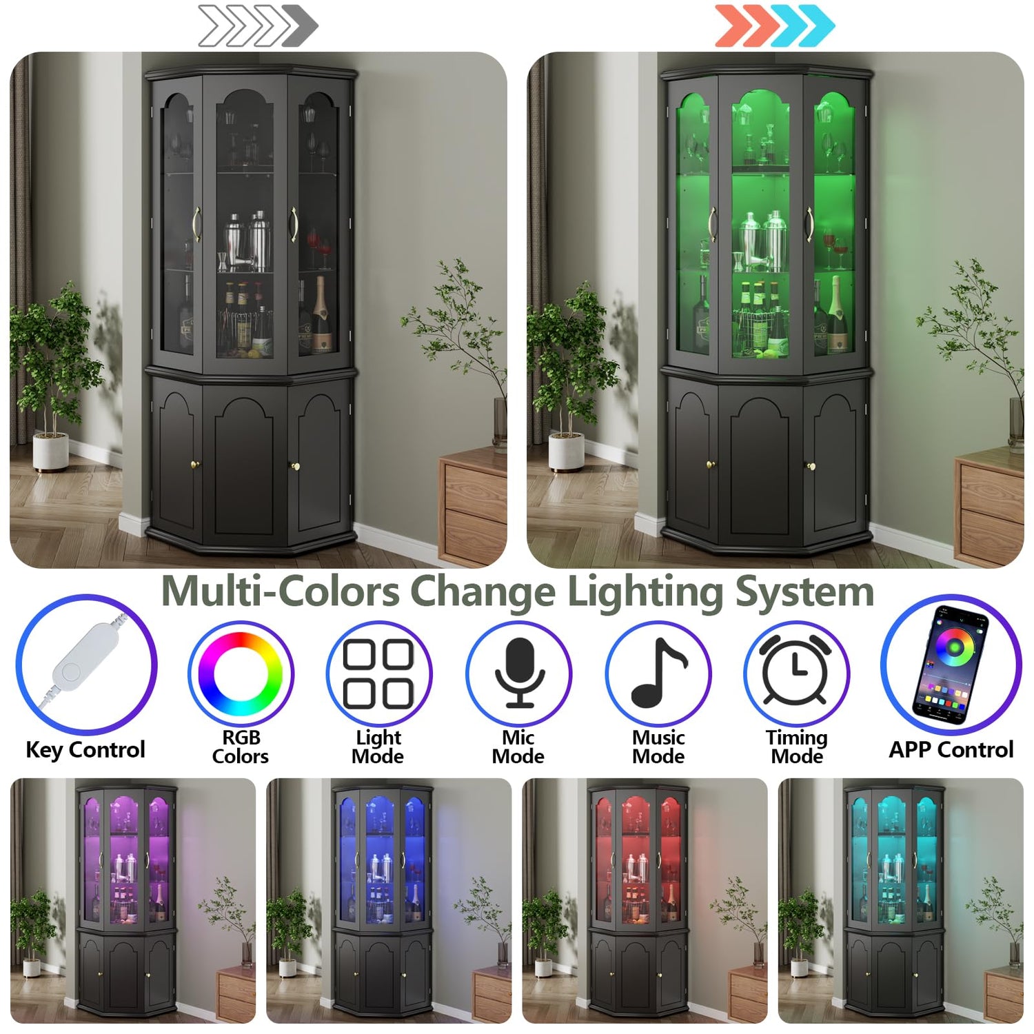 - [Wine Cabinet with LED Light] The inclusion of LED lights adds a touch of style and sophistication to this wine storage cabinet. Features LED lights that can be set to various colors and intensities, allowing you to create a captivating ambiance in your space while allowing you to display it in a visually appealing manner, making the wine collection a focal point in the room. Whether you're hosting a gathering or simply enjoying a quiet evening, the LED lights in the corner wine cabinet enhance the overall atmosphere and elevate your wine experience.