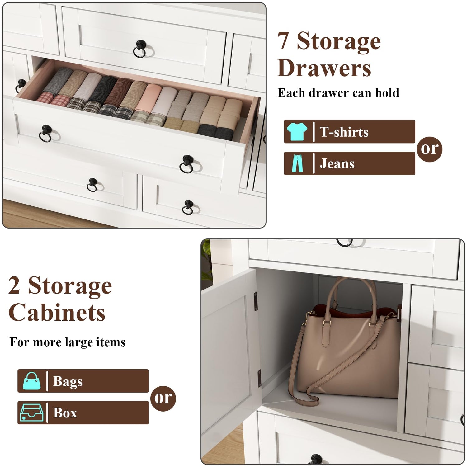 - [7 Drawers Bedroom Dresser]-This large white dresser has 7 deep drawers and 2 doors, 7 deep drawers provide ample space for neatly arranging and categorizing items, from clothing and accessories to linens and other essentials. 2 spacious cubbies enable flexible storage of different-sized items. And the top surface of the tall dresser can serve as a dresser TV stand entertainment center or display your decorations.