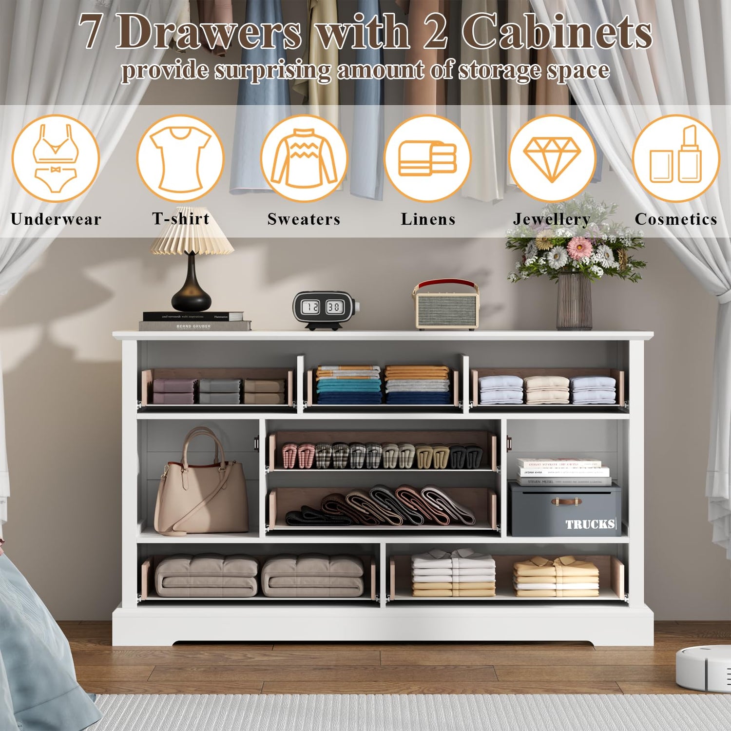 Gyfimoie Farmhouse 7 Drawer Dresser for Bedroom, Wood Chest of Drawers with 2 Doors, White Dressers with Round Metal Handle, Large Storage Dresser Organizer, Long TV Stand for Living Room, White