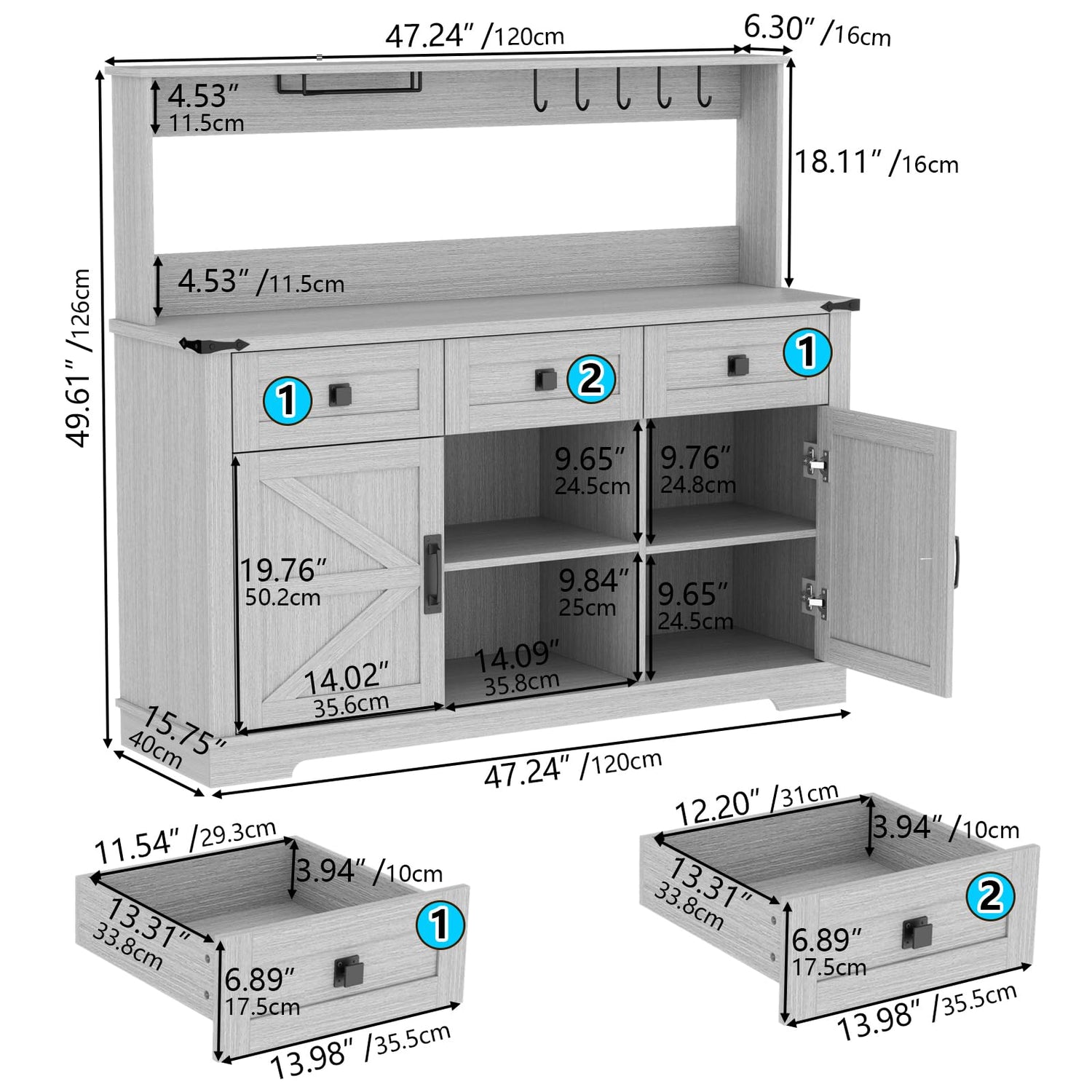 - [Multi-Storage Application] This coffee bar serves multiple purposes in various occasions. Its spacious top as a serving area or a display space during gatherings. The cabinets and drawers offer ample storage for dining essentials. Overall storage capacity make it can also be wine cabinet, sideboard buffet cabinet and kitchen cabinet.