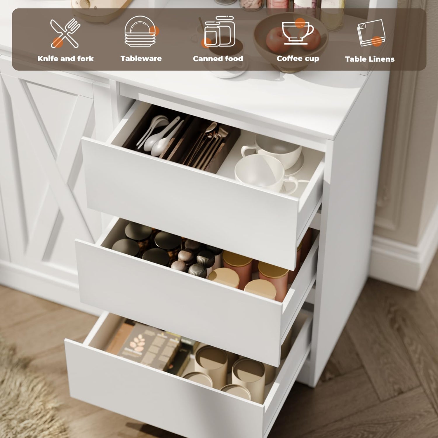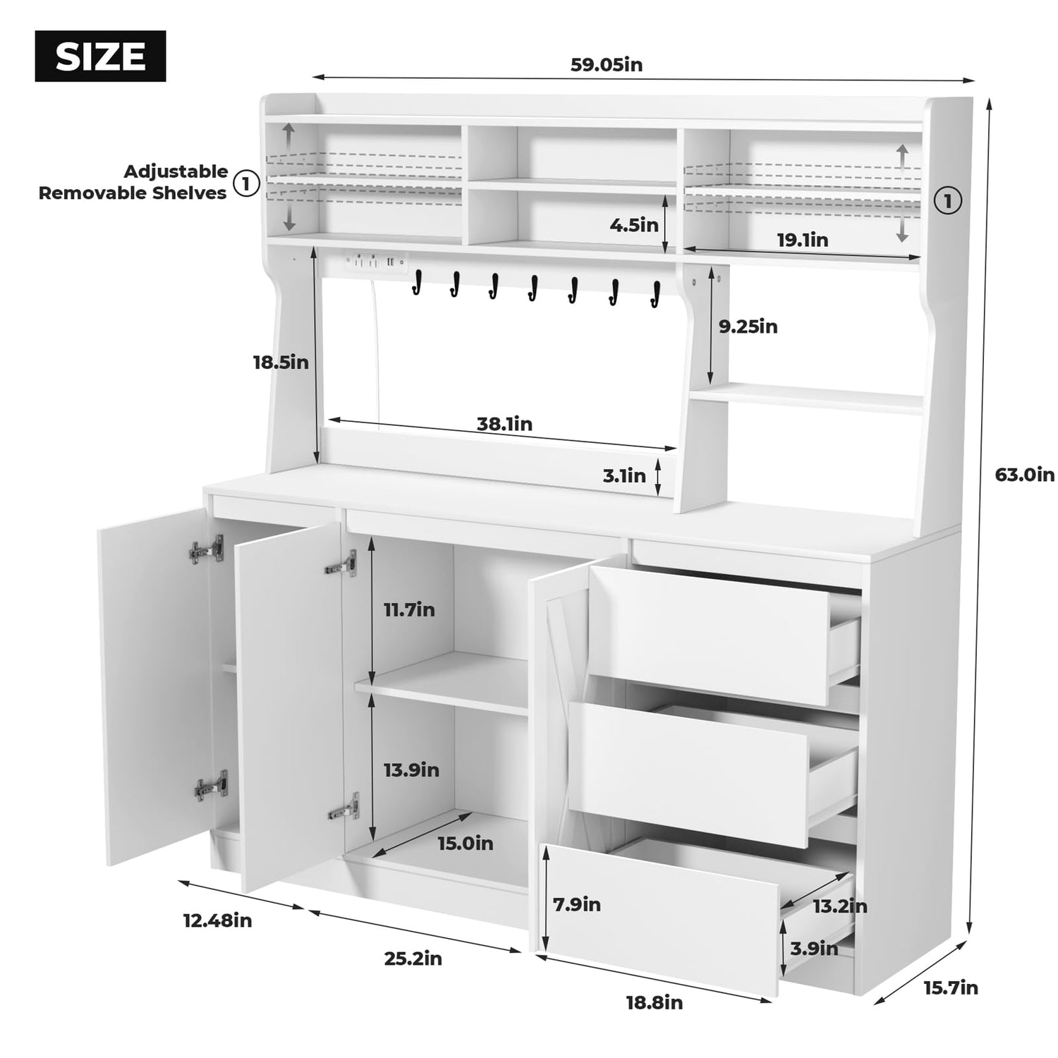 - 【Perfect Storage Solution】This kitchen hutch cabinet offers large storage space, measuring 15.7"D x 57.8"W x 63"H, with well-organized compartments. Three doors, three drawers, and open shelves seamlessly blend hidden and open storage. The spacious countertop easily accommodates appliances like a microwave or coffee maker, while the included wine glass holder and rack make it perfect for wine enthusiasts.