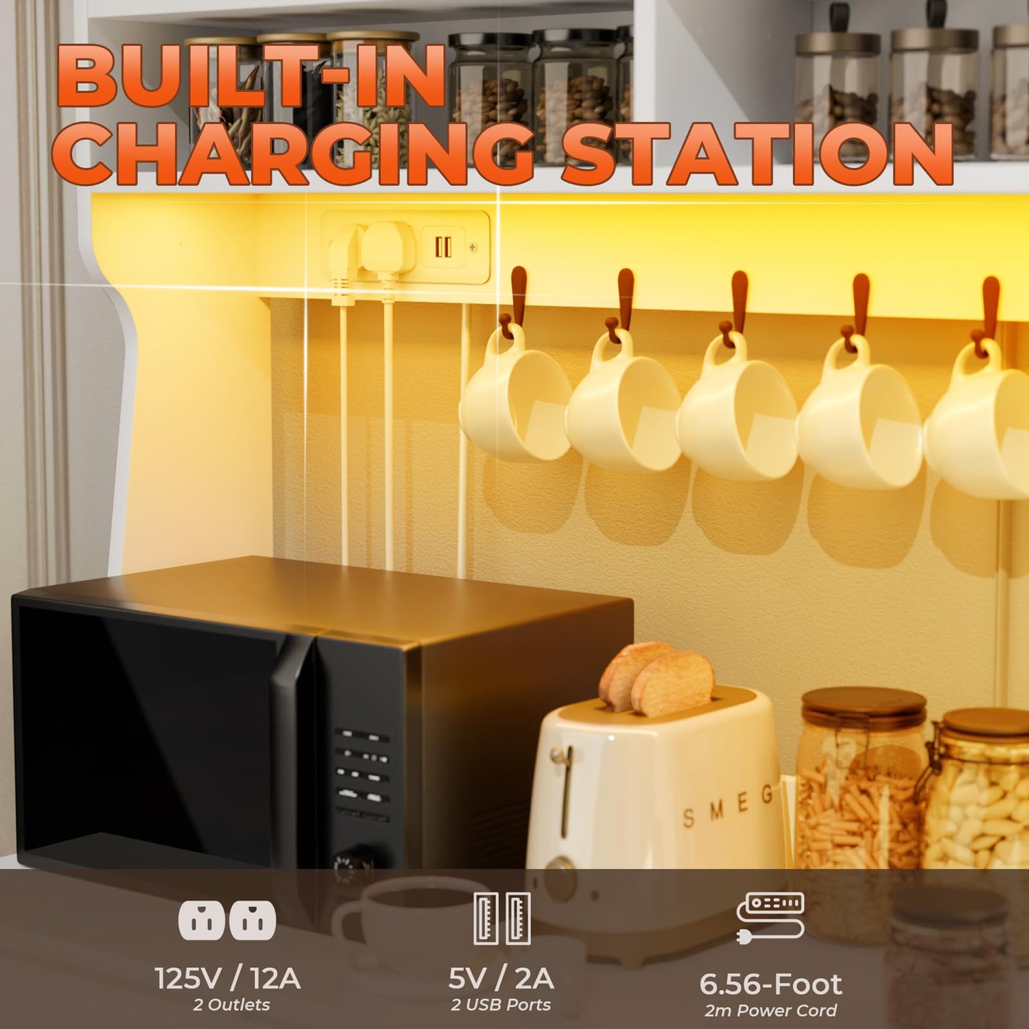 Gyfimoie Farmhouse Kitchen Pantry Cabinet with Power Outlet & LED Light, Large Coffee Bar Cupboard with Microwave Stand, 3 Doors & 3 Drawers, 7 Cup Holders & 8 Open Cubbies, Adjusted Shelves (White)