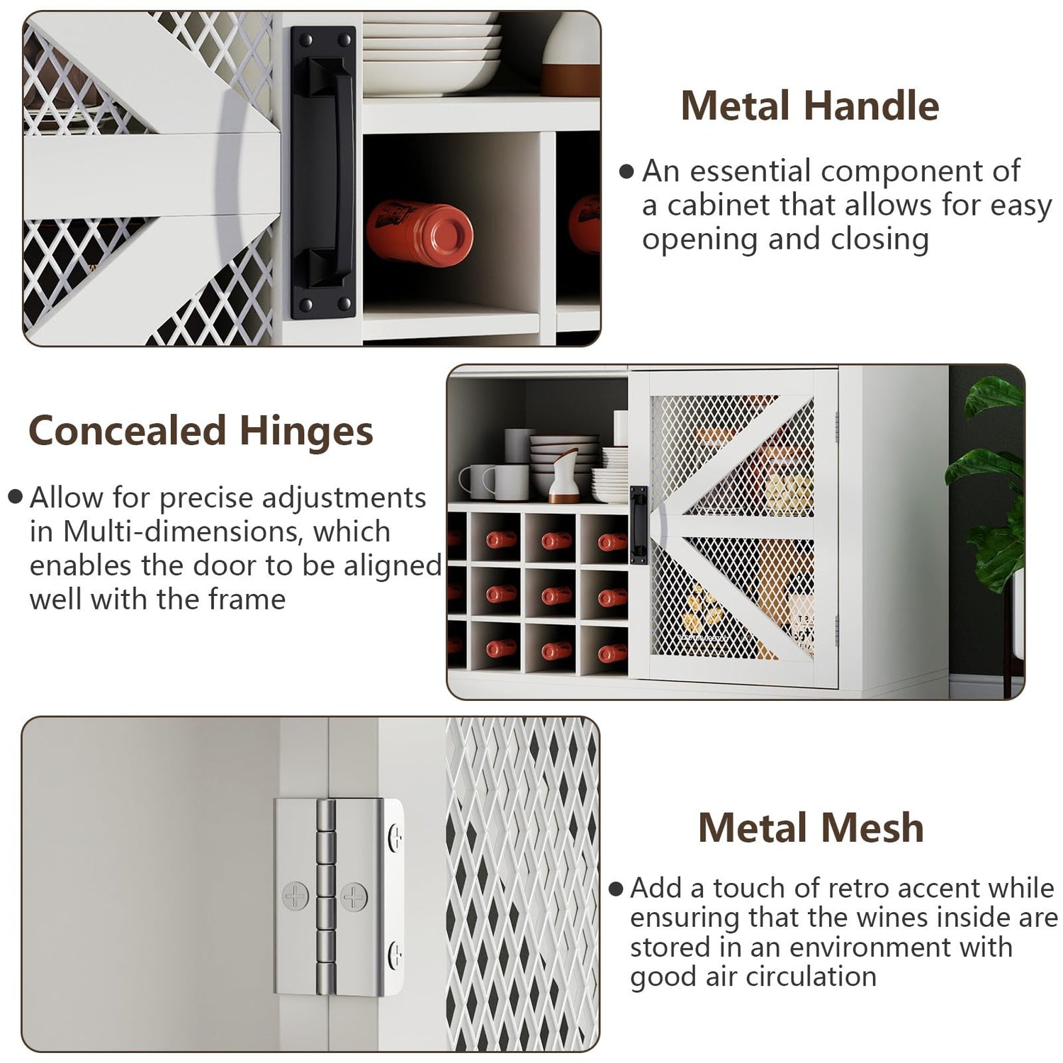 - [Versatile Applications for Every Space] This Wine Cabinet isn’t just for wine – it’s a versatile piece designed to fit your lifestyle. The spacious top is perfect for a coffee maker, turning it into a stylish coffee bar. The two mesh-door cabinets are ideal for serving dishes, storing tableware, or displaying decorative items. Whether you need a coffee bar station, a buffet sideboard, or a chic storage solution, this wine bar cabinet has you covered.