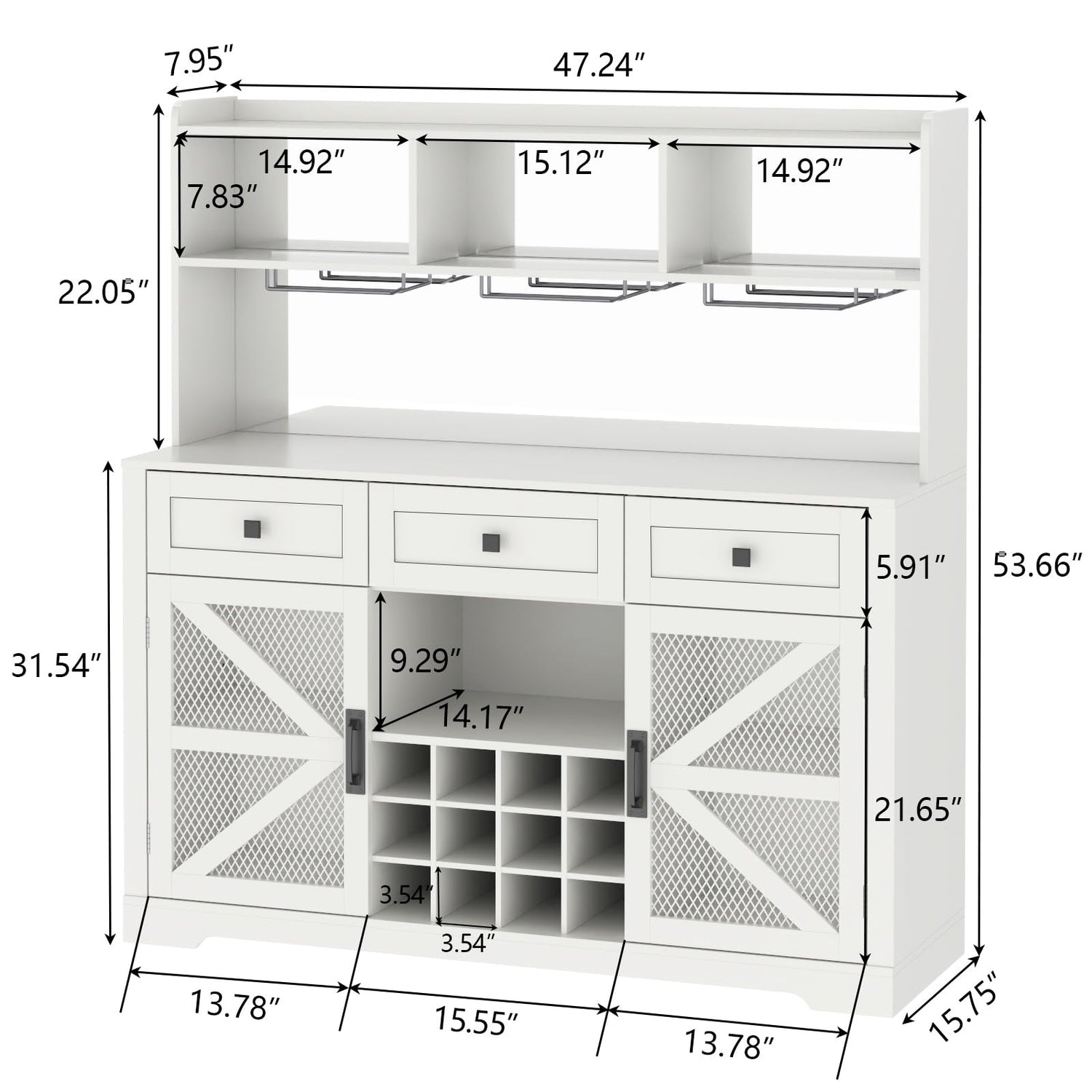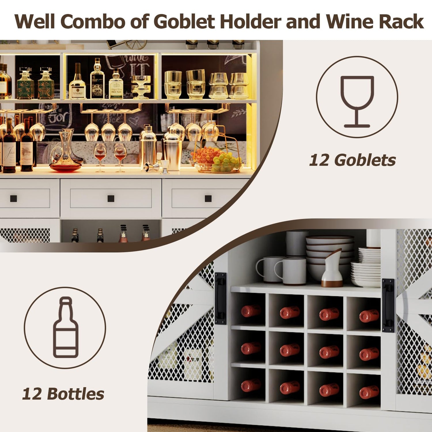 - [Large Storage Wine Cabinet] As a luxurious and highly functional storage solution, this liquor cabinet can accommodate your growing wine collection and all your bar essentials. 3 rows of highball glass racks holding up to 12 glasses The heart of the bar cabinet boasts a sturdy wine rack that can hold up to 12 bottles, ensuring your favorite vintages are always within reach. 3 drawers is ideal for organizing bar tools, corkscrews, napkins, and other accessories. Dual mesh door cabinets perfect for storing additional bottles or bar supplies while maintaining airflow.