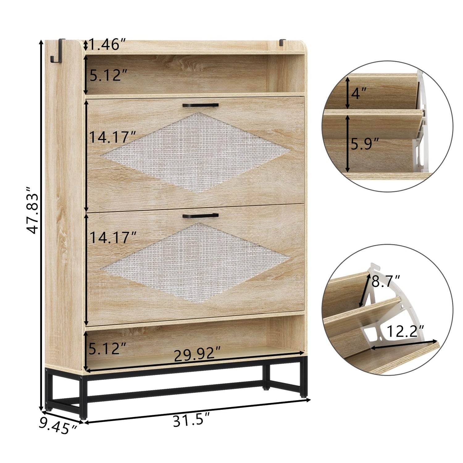 - [Perfect Shoe Storage Solution] This rattan shoe cabinet with 2 flip drawers is a game-changer for organizing your footwear. No more worrying about shoes scattered around the house or clean shoes gathering dust before being worn. Say goodbye to messy entryways and crowded closets—the cabinet’s space-saving design instantly upgrades your space. Its double doors, elegantly adorned with intricately woven rattan, and flip-out compartments make it easy to find the right pair of shoes, while the open shelves are perfect for storing keys, bags, and other essentials. Whether you’re a shoe lover or simply seeking tidiness, this cabinet is the ideal solution for keeping your shoes neat and accessible.