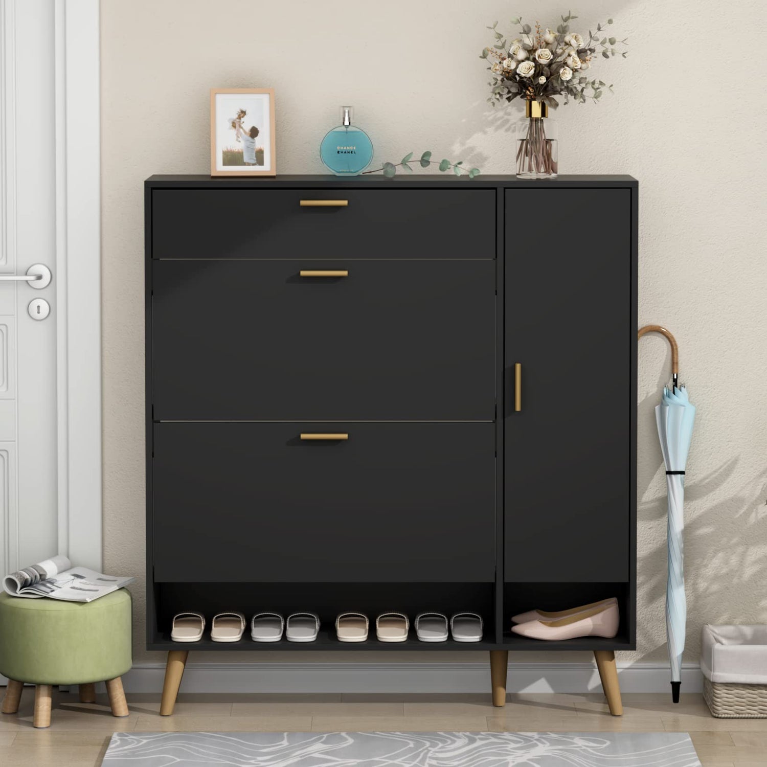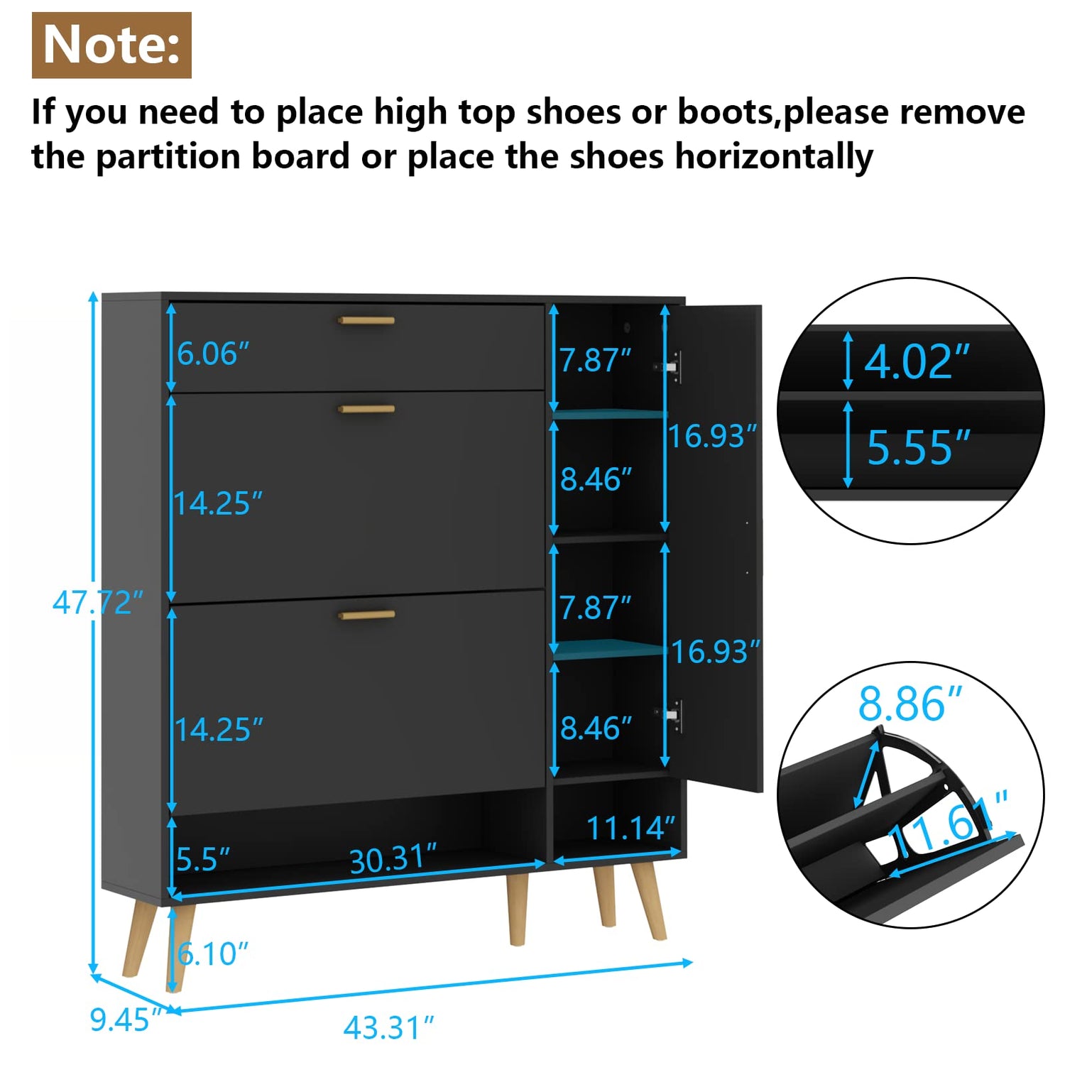 - [ NEEDS ATTENTION] - According to the size of this shoe rack, make sure it fits your shoe shape and if you need to store high-top shoes or large-sized shoes, please remove the partition in the flip drawers to fit the shoes, or place the shoes horizontally. Also, for easy storage of boots, please remove the removable partition in the right side cabinet.