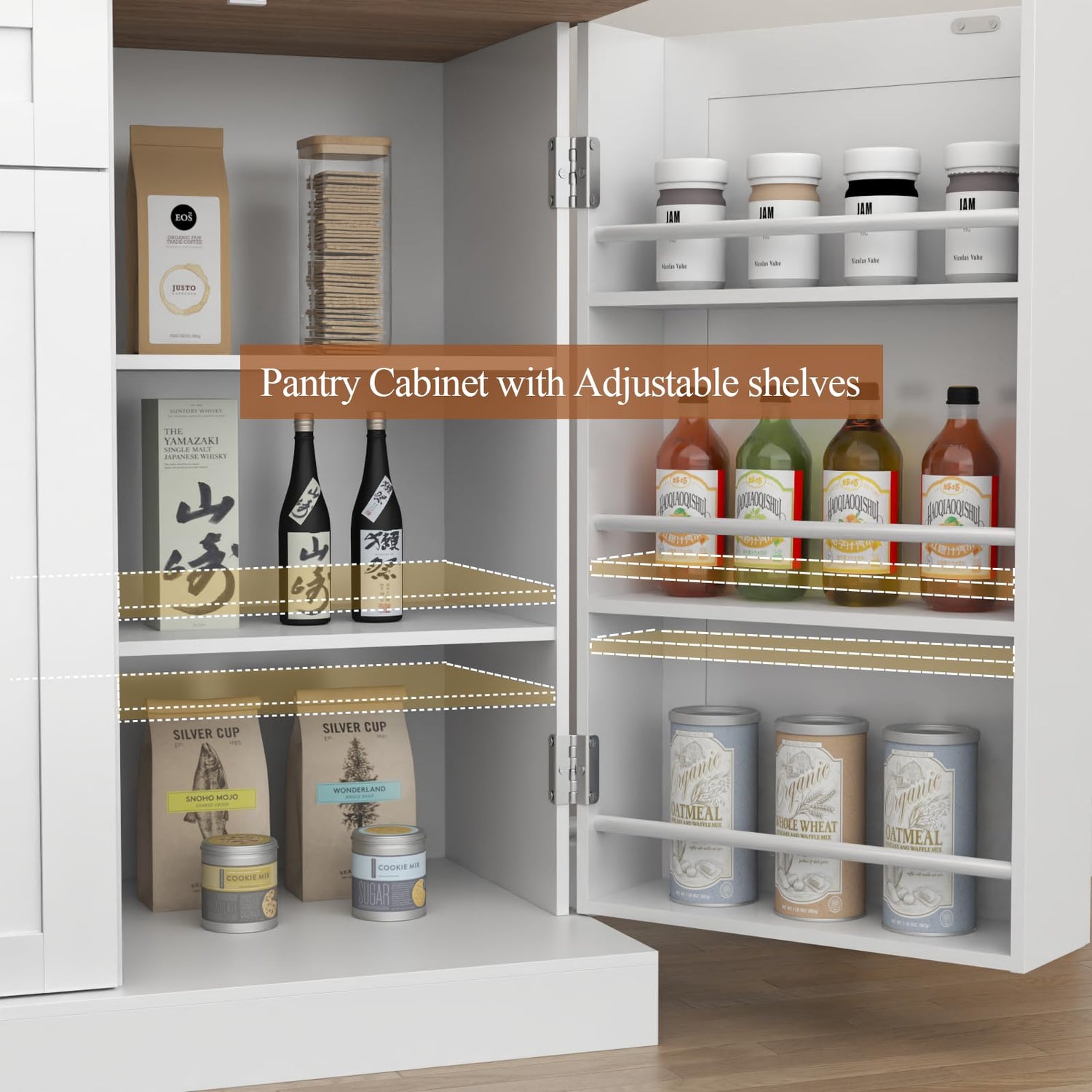 - Features Kitchen Pantry Storage Cabinet - With 3 doors and abundant storage space, this cabinet efficiently addresses kitchen storage challenges. It offers a combination of open and concealed compartments to accommodate various items. The right door includes 2 side shelves, ideal for organizing bottles and jars. These shelves are thoughtfully designed with metal bars to secure items in place and prevent them from falling off. Well, the two adjustable shelves behind the doors of the right pantry cabinet are designed to give you just that. You can easily adjust the height to suit your needs.