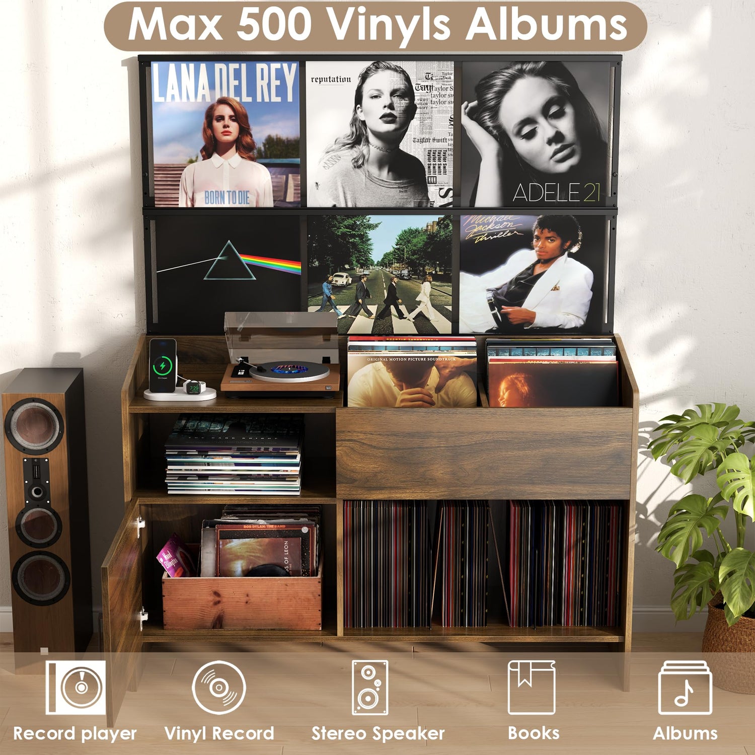 - [Massive Capacity & Versatile Storage] This premium storage cabinet holds up to 500 vinyl records! Organize your collections effortlessly within its spacious compartments. The top surface provides the perfect platform for your turntable, while the middle compartment neatly houses your CD player. Plus, enjoy abundant storage: Utilize the top cubby holes, lower partitioned sections, and the storage cabinet to store vinyls, albums, CDs, audio accessories, or other items.
