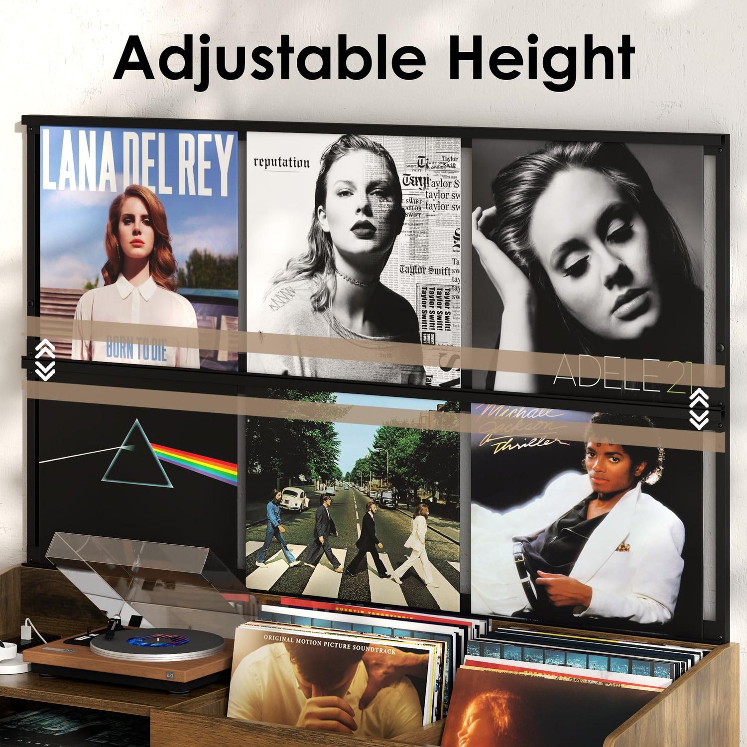 - [Upgraded Vinyl Storage Cabinet] This record player stand features an innovative design - the metal vinyl display rack. You can 'liberate' a few selected records from the cabinet and display them in a more prominent position for easy access. And the rack displays the exquisite covers of the vinyl records, making them the visual focus of the space, greatly enhancing the beauty of the space and the musical atmosphere, and bringing you an excellent visual experience.