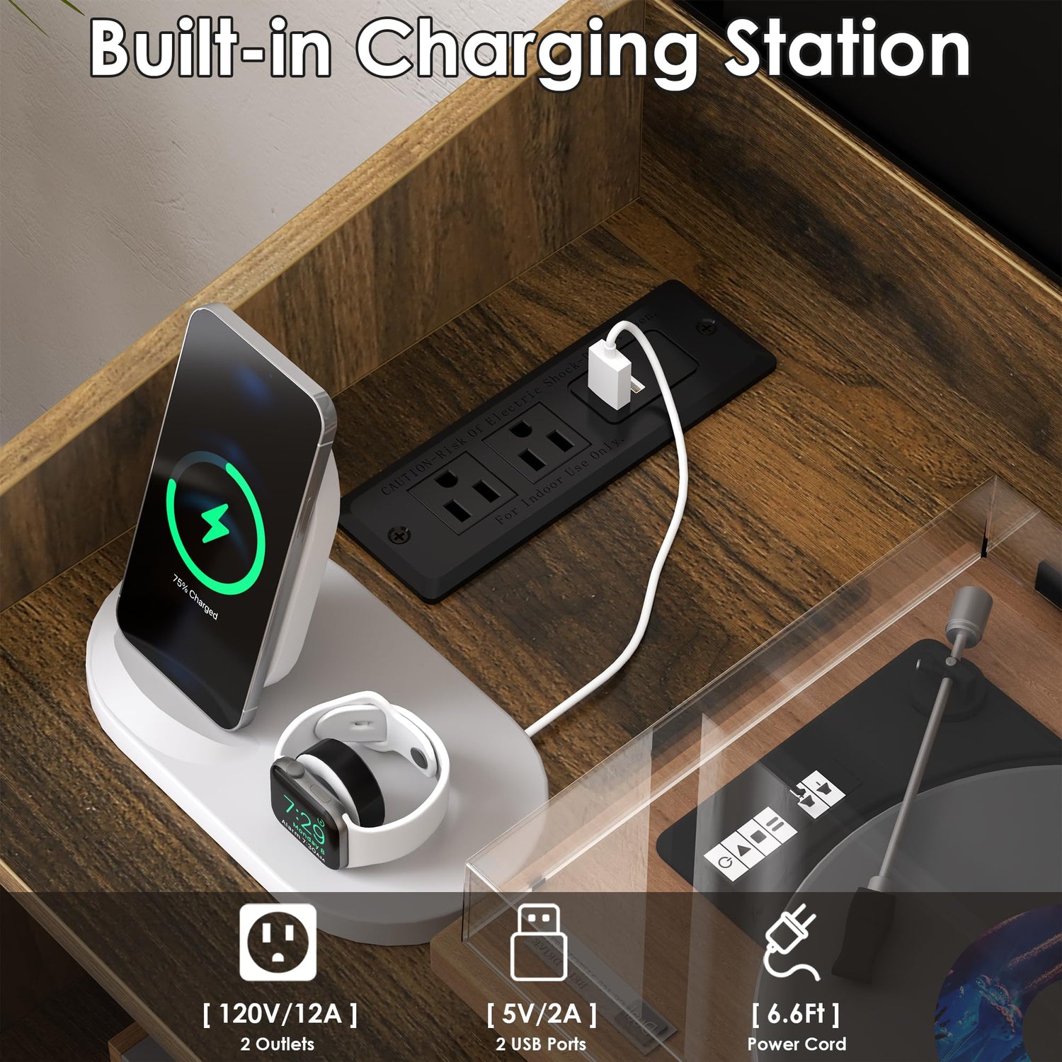 - [Built-in Power Outlet & Anti-tipping Device] This record storage cabinet is equipped with a built-in charging station with 2 AC and 2 USB ports, which can directly power your turntable, CD player, speakers and accessories without cumbersome cables or extension cords! It is also features an anti-tipping device to enhance stability and ensure the safety of your family.