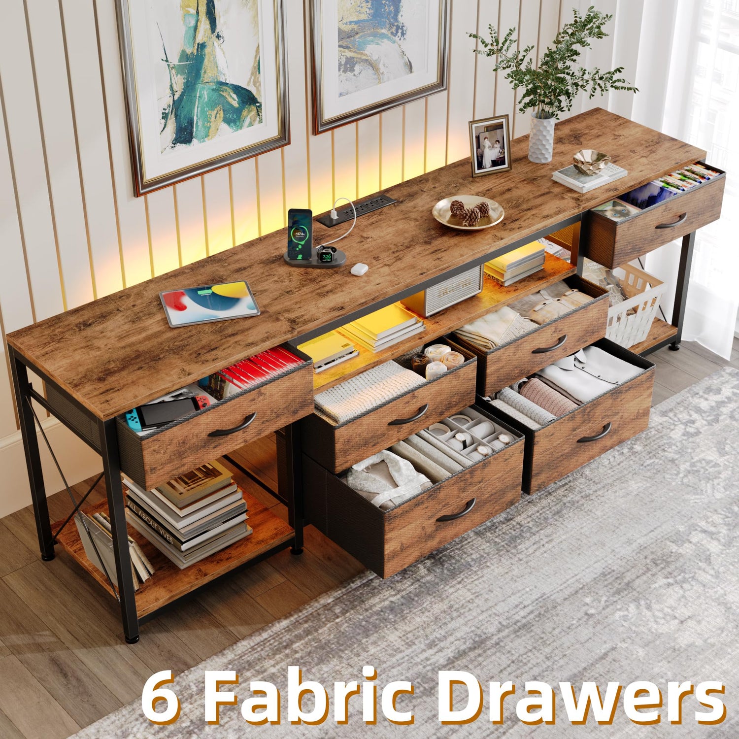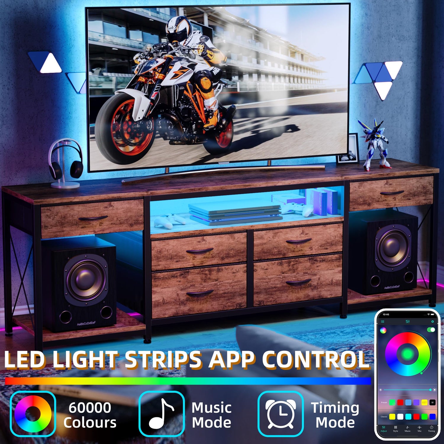 GYIIYUO LED TV Stand with 6 Fabric Drawers and Power Outlet for 65 70 75 Inch TVs, Entertainment Center with Open Storage Shelves, Dresser TV Stand for Bedroom/Living Room, Rustic Brown