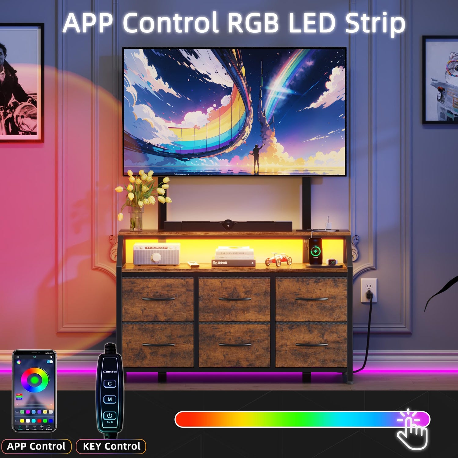- Elevate Your Home Entertainment: Take your home entertainment to the next level with this innovative dresser TV stand with mount. Featuring a dynamic LED light strip that can change colors and brightness with the beat of your music, it creates an immersive ambiance for any occasion.