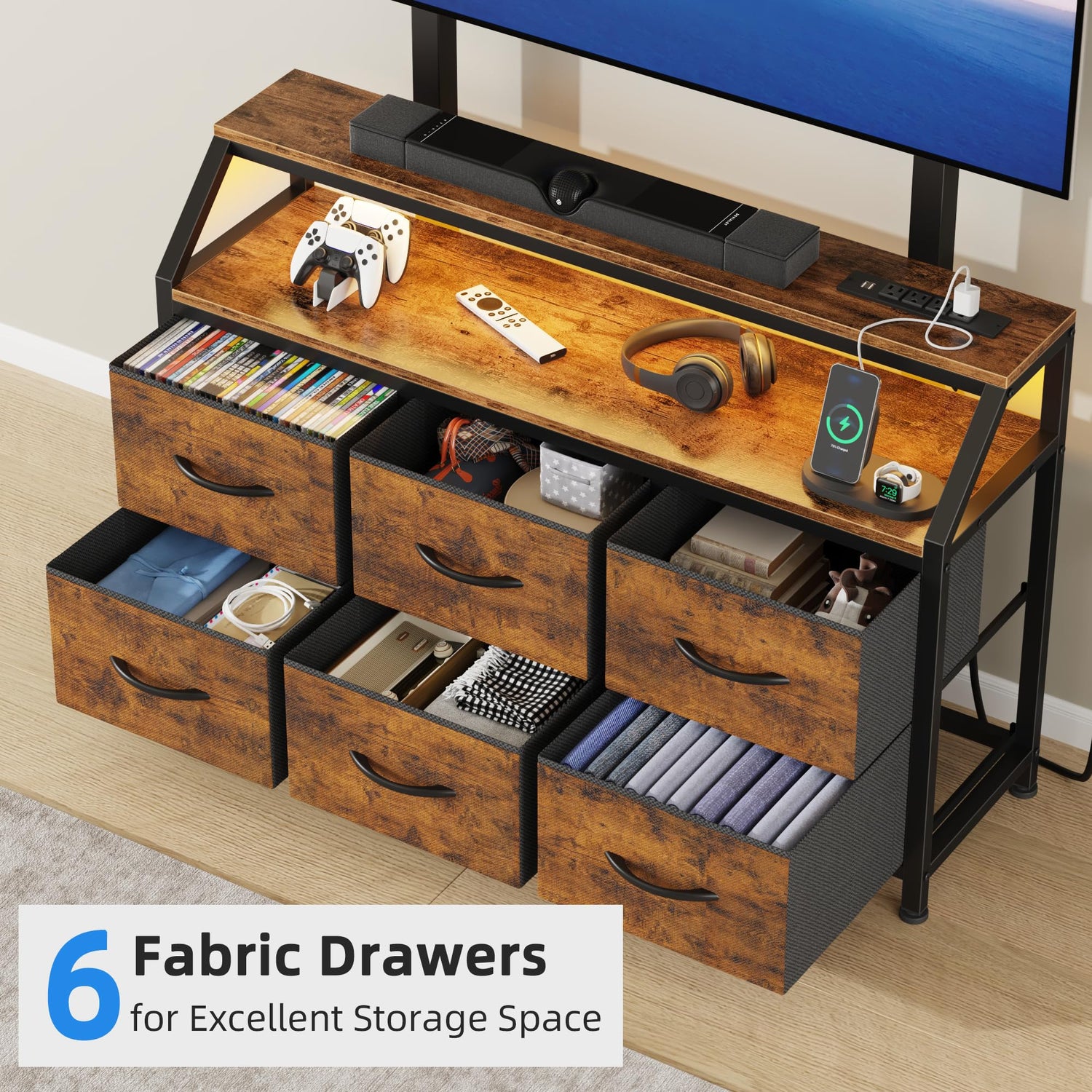 GYIIYUO LED TV Stand with Mount and Power Outlet & 6 Fabric Drawers for 32-75 Inches TV - Entertainment Center and Industrial TV Dresser Console Table for Living Room, Bedroom- 47" Rustic Brown