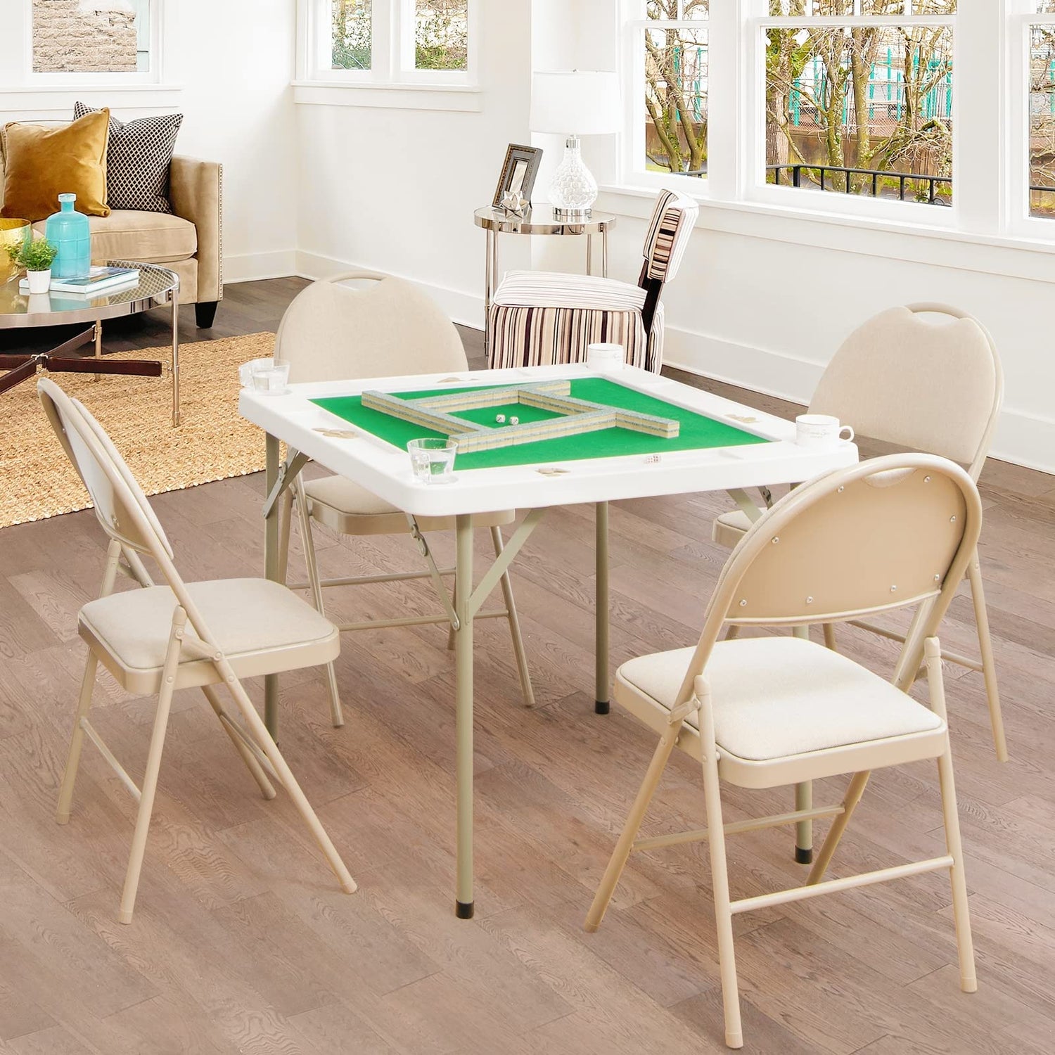 GYMAX Mahjong Table, Folding Square 4 Player Card Table with Cup Holders & Chip Trays, Portable Board Game Domino Table for Mahjong, Poker Blackjack