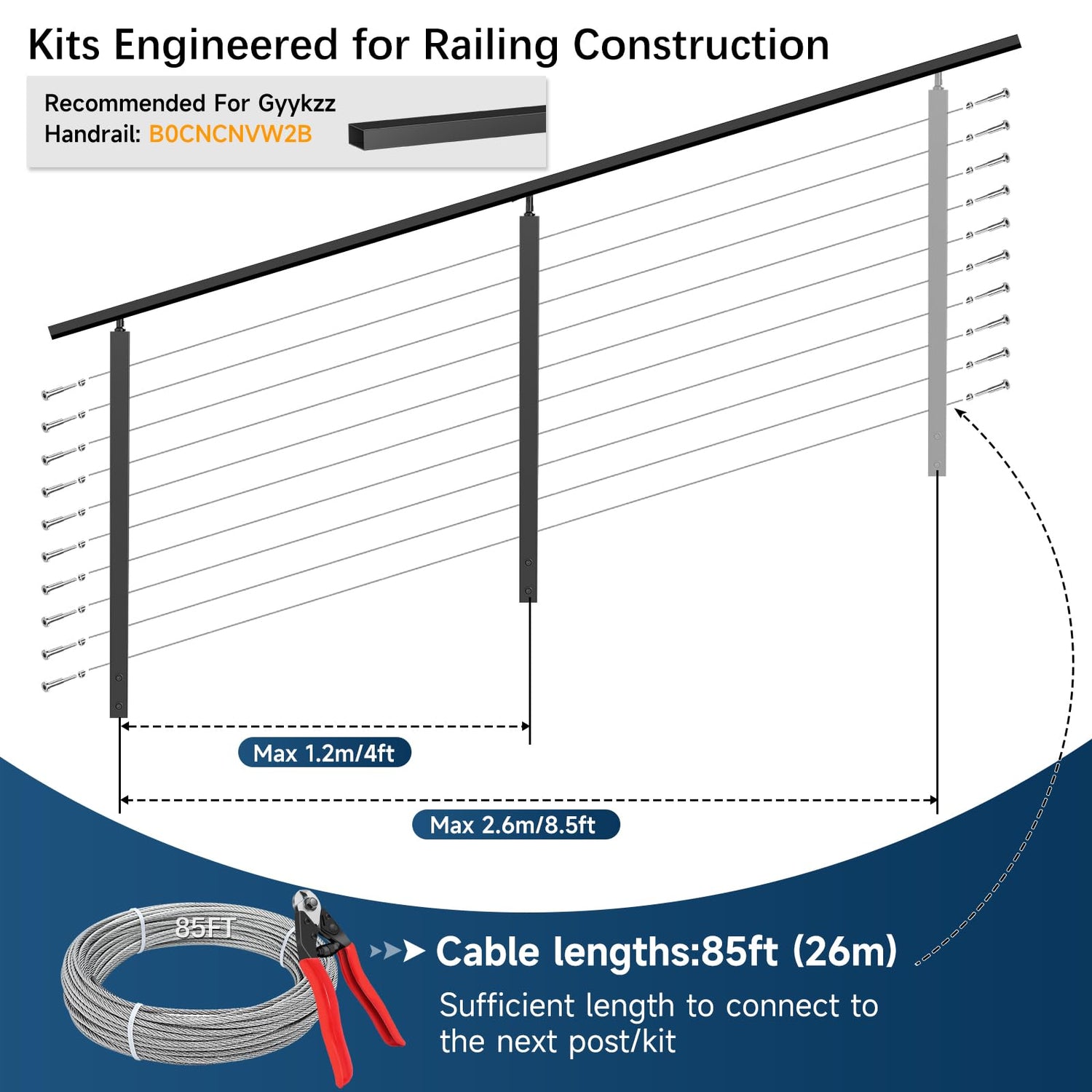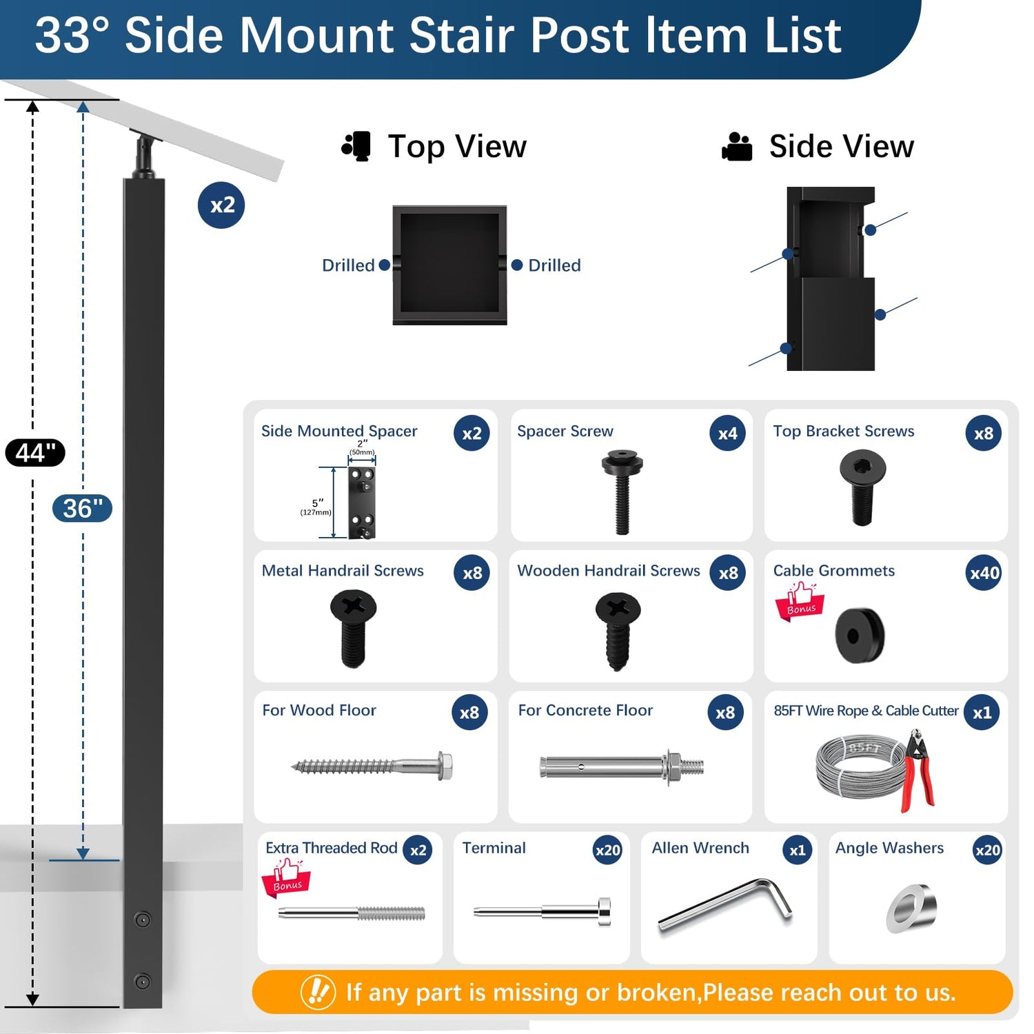 - Effortless Side-Mount Installation: This 36" side mount stair cable railing post kit is designed for installation on the side of decks, making it ideal for 36" residential projects. Our one-stop side-mount cable railing kit includes all necessary installation components, with cable length sufficient to connect to the next post (Handrail and crimping tool not included).