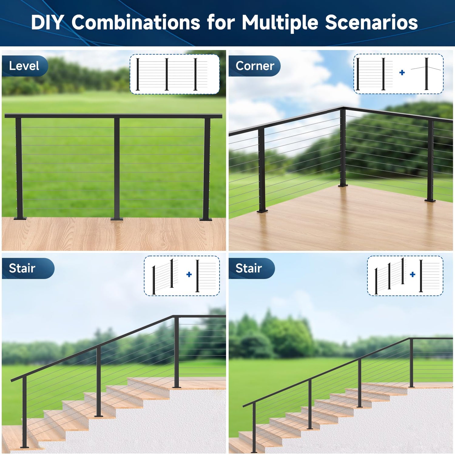 - 36" Stair Railing Post: The package does not include the top handrail or cable crimper. Verify local cable railing codes before purchasing. This 36" height solution suits residential projects in some states. Our "One-Stop-Railing" solution simplifies the process by providing all essential components and cost-saving benefits.