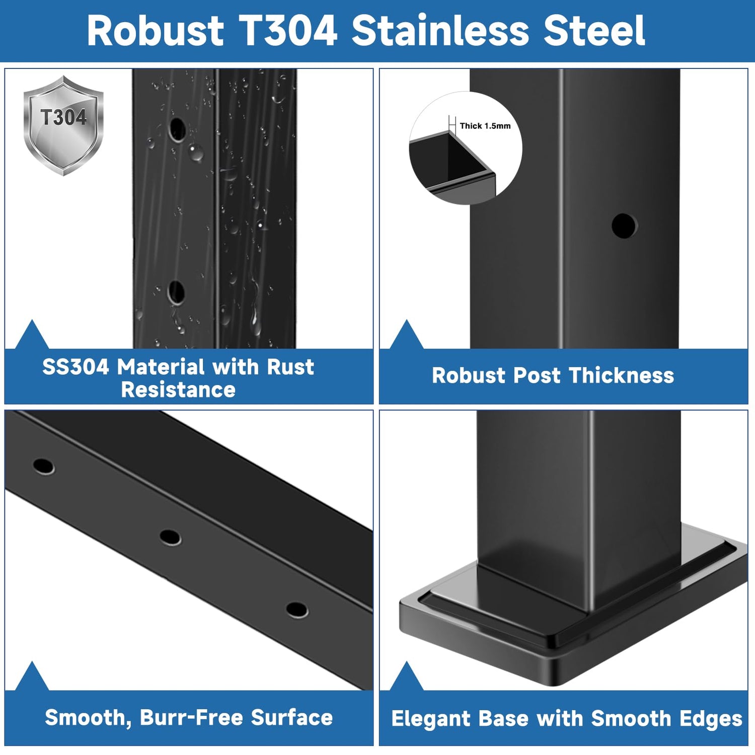 - Premium Material: Our line post is made from robust stainless steel 304 with a black powder coating, offering high hardness and impact resistance to prevent deformation. The black cable rubber grommets are designed to withstand wear and tear, providing stable support for your cables and ensuring a perfect fit for all stair angles.
