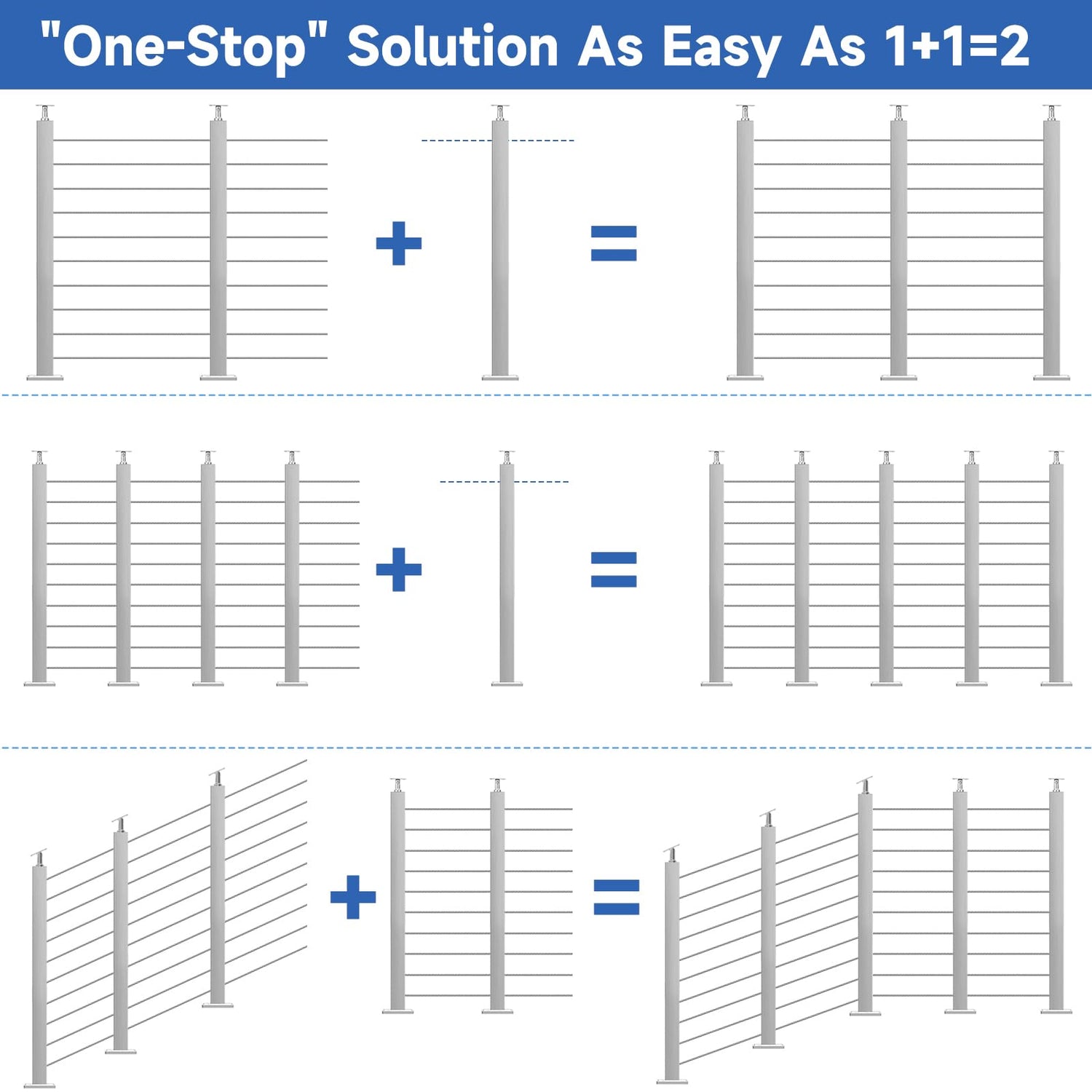 • Level Drilled Railing Posts: The cable railing post package doesn't include the top handrail or cable crimper. Please check local cable codes before purchasing. This 36" height is suitable for residential projects in some states. (However, this brushed finish post is not recommended for areas within 10 miles of saltwater). Our "One-Stop-Railing" solution saves time, effort, and money by providing all necessary parts in one package, avoiding the hassle of searching or mismatching.