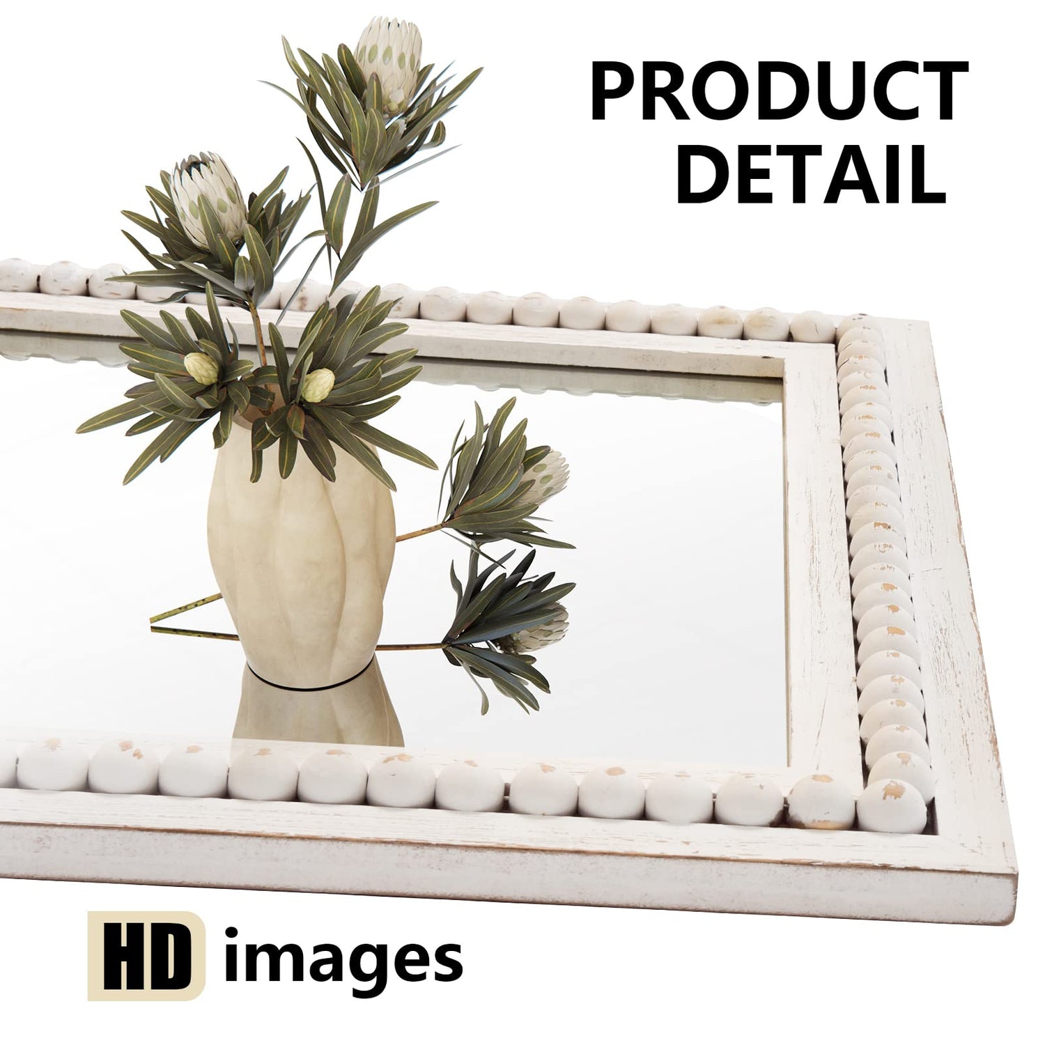 Details: Rustic Rectangle Mirror, 22x30" Wooden Square Decorative Mirrors,Farmhouse Wall-Mounted White Beads Decor Mirror for Bedroom, Bathroom, Living Room,Vanity