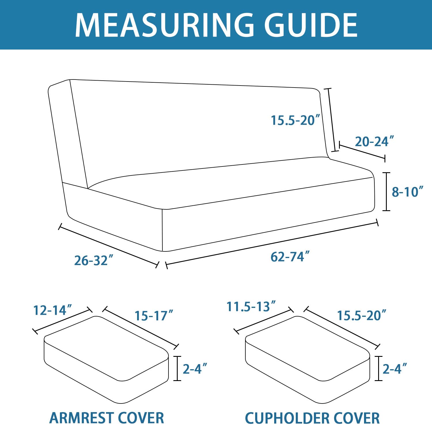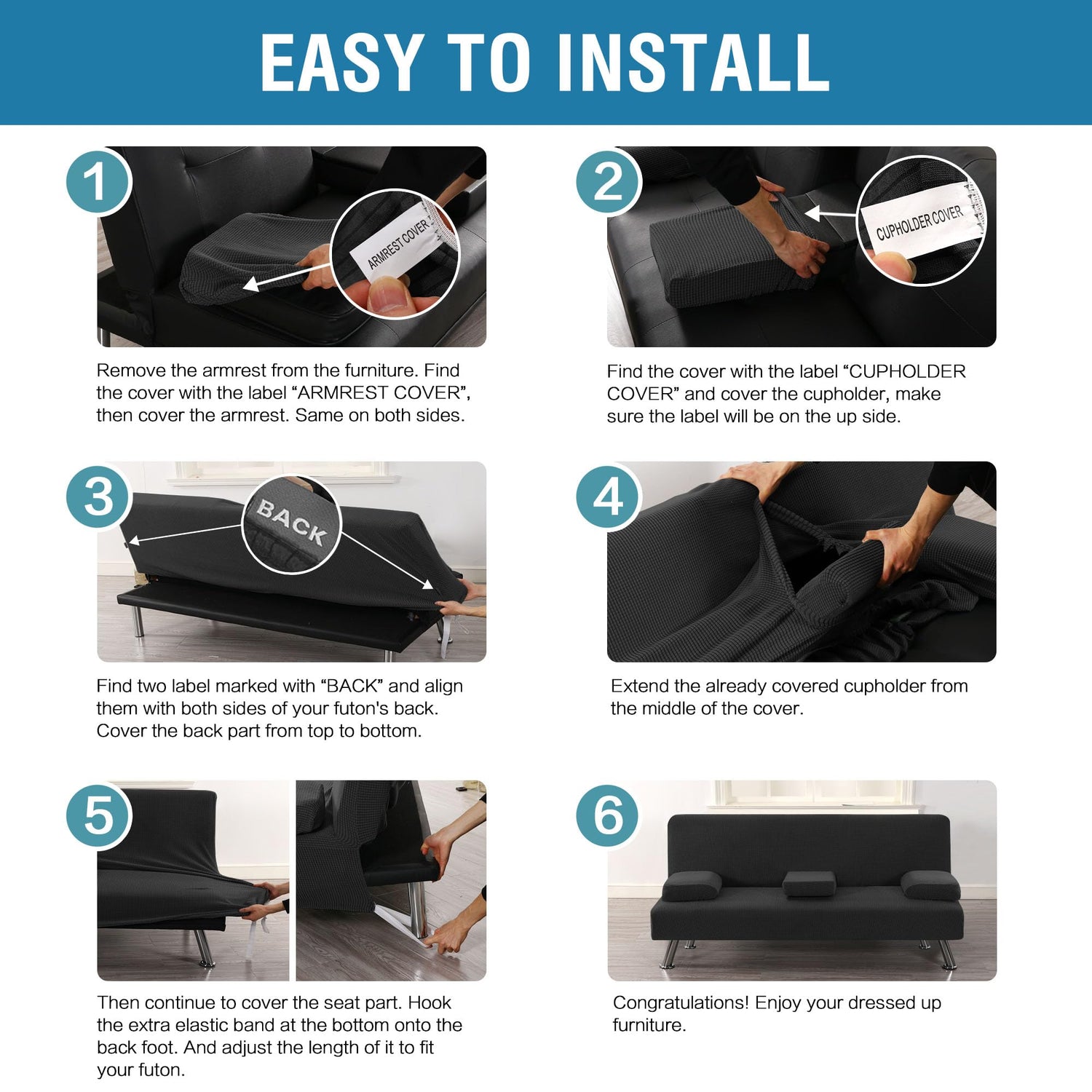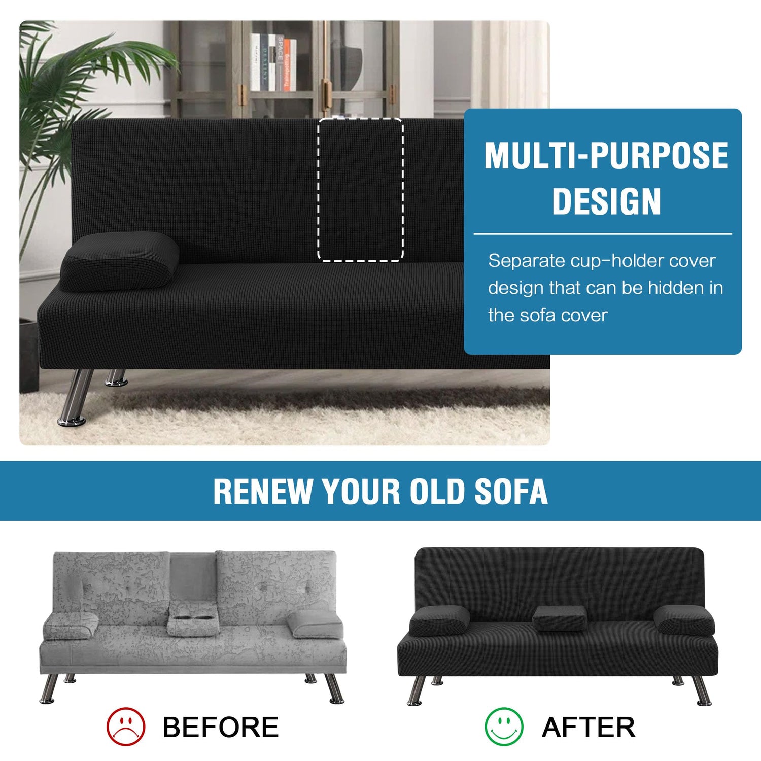 - GREAT FIT: This innovated 4 Pieces Futon Slipcovers with removable armrests and cupholders covers is crafted from durable and soft high stretch knitted jacquard fabric. Fit sitting width between 62-74 inch. Feature one-size-fits-most, kindly measure before ordering