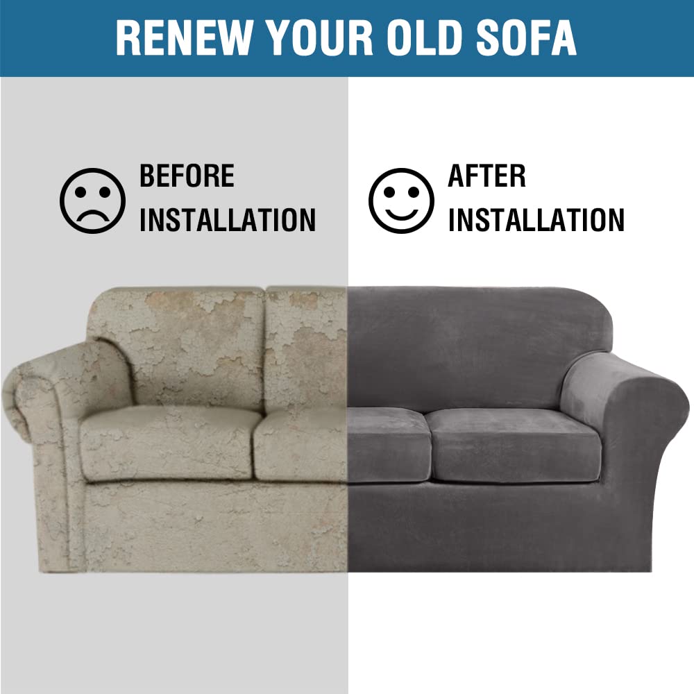 - GREAT FIT: This innovated 4 Piece sofa couch cover is crafted from luxurious velvet plush fabric, including 1 piece of base cover and 3 piece of cushion covers. Sofa slipcovers (fit sitting width between 72-90 inch). Feature one-size-fits-most, kindly measure before ordering