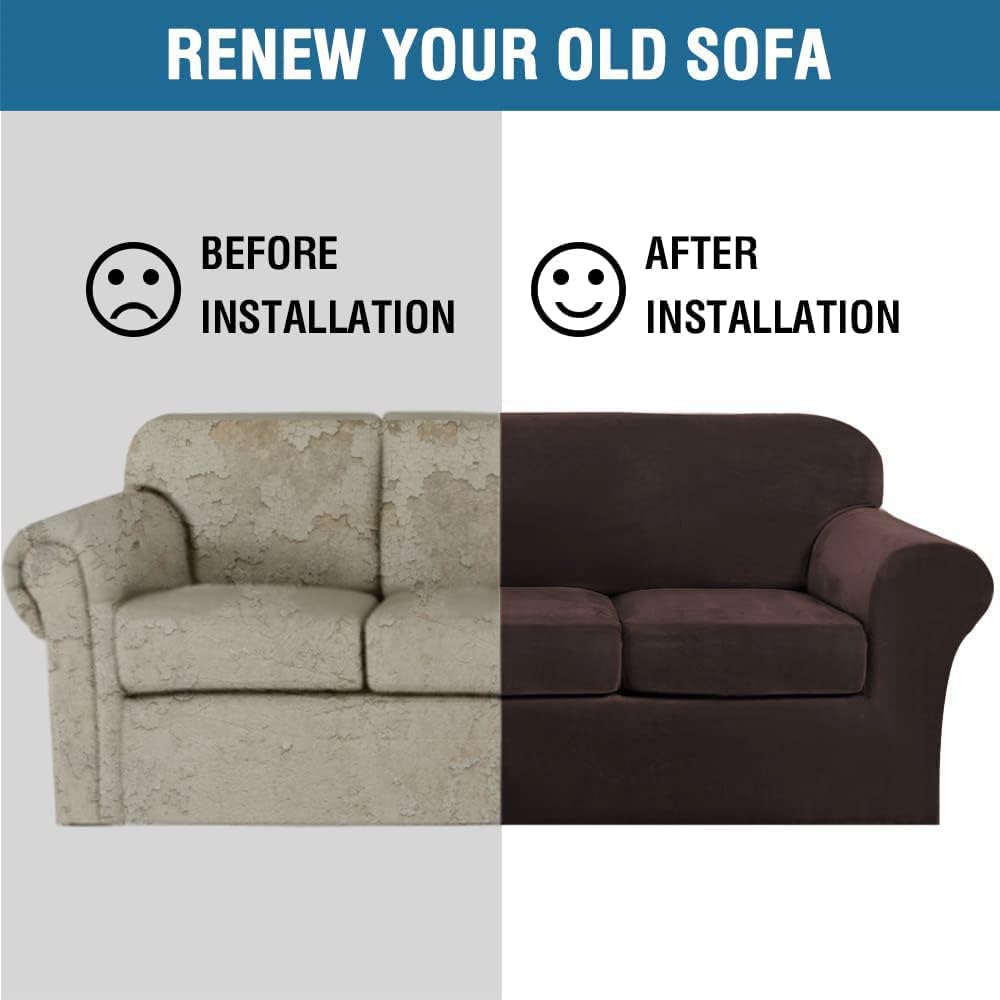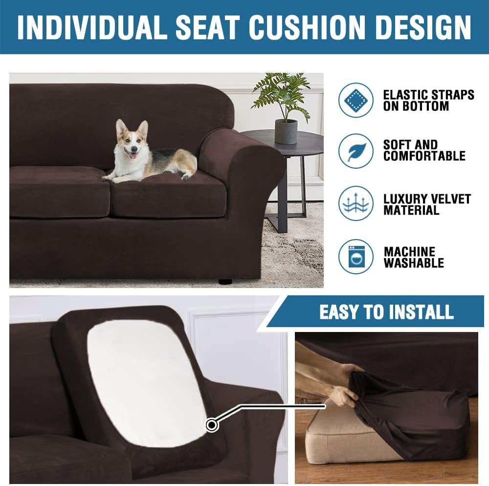 - GREAT FIT: This innovated 4 Piece sofa couch cover is crafted from luxurious velvet plush fabric, including 1 piece of base cover and 3 piece of cushion covers. Sofa slipcovers (fit sitting width between 72-90 inch). Feature one-size-fits-most, kindly measure before ordering