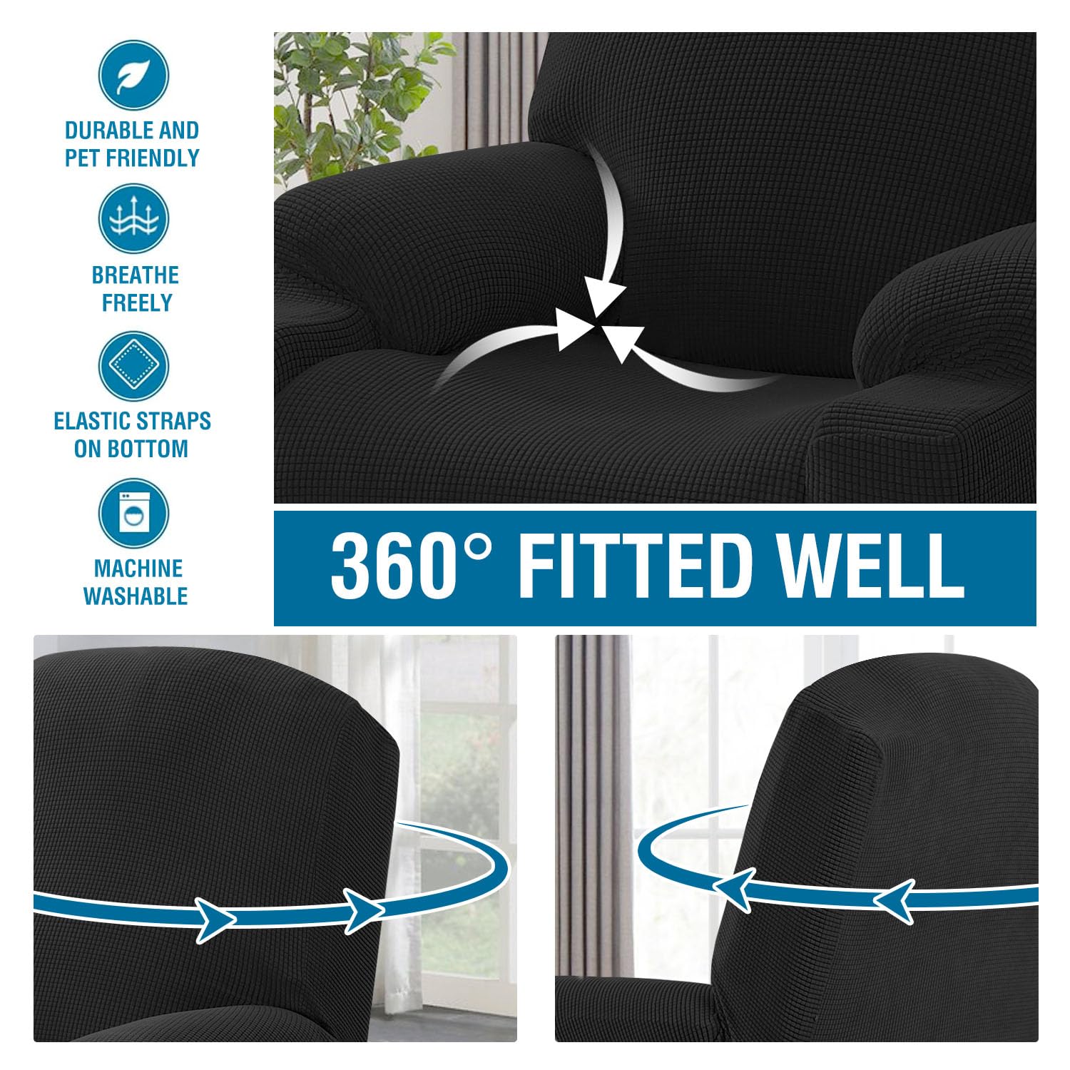 H.VERSAILTEX Stretch Couch Cover Recliner Cover Electric Power Lift Recliner Chair Cover Fitted Standard Large Power Lift Recliner with Side Pocket, Soft Thick Jacquard(Single Seat, Black)