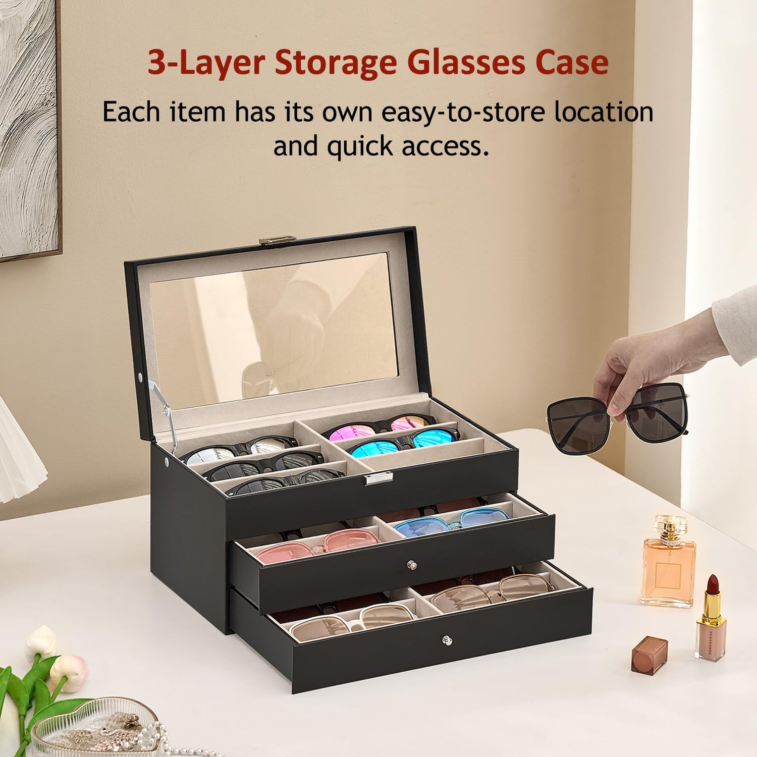 - Classic and Elegance - The luxurious appearance of interior with soft lining and PU leather exterior elegant black making this sunglass organizer a perfect addition to your dressing table and desk. The removable drawer design and top glass lid of sunglasses case are the great choice for displaying glasses, sunglasses organizer is perfect use in clothing rooms, bedrooms and shops.