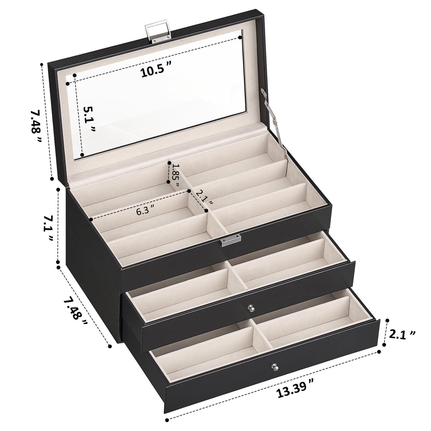 - Large Storage Capacity - With its three-layer design, this glasses case not only looks great but also maximizes storage space. 18 Slots make sure all your glasses have enough space to organize. 3 Layer and 18 slots Large capacity sunglasses organizer also fits all your collections of glasses, watches, jewelry etc. Product size: 13.39 ″ * 7.48 ″ * 7.1 ″. Compartment size: 18 Slots - 6.3 ″ * 2.1″ * 1.85″.