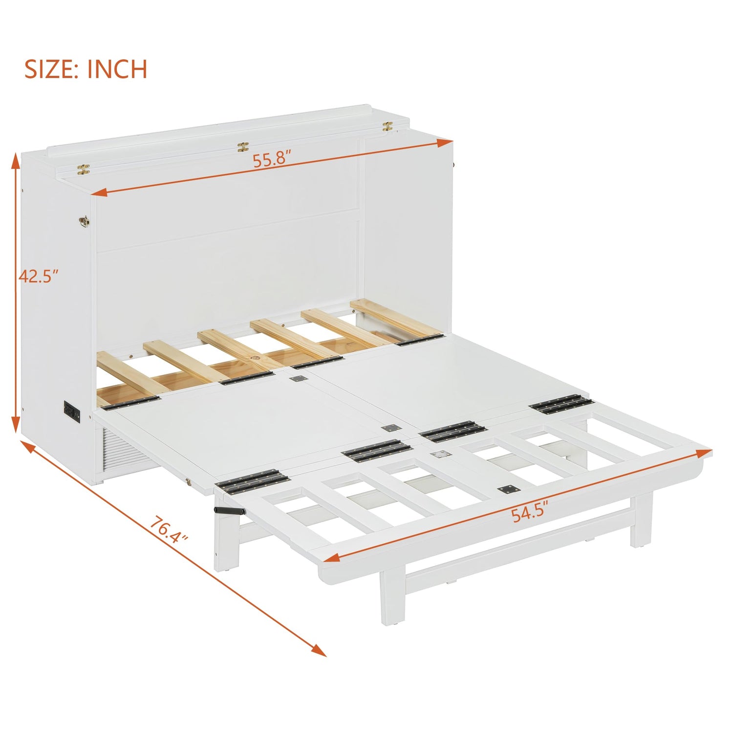 HABITRIO Full Size Murphy Bed, Wood Full Murphy Bed Frame with Large Drawer, USB Ports and Outlets, White