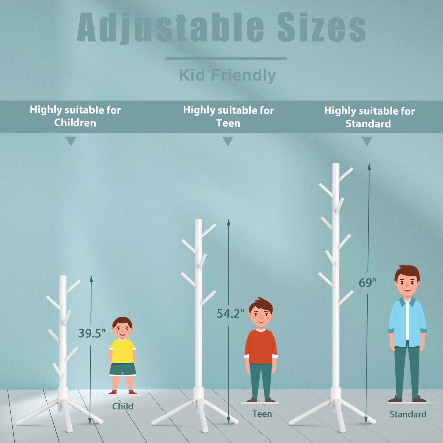 - ADJUSTABLE HEIGHT for USAGE: Four sections design and you can customize the rack height and hooks as you like. Two sections heigth (39.5”) can be put at beside; Three sections height (54.2”) is for for a kid use; Four sections height (68.8”) is for adult use