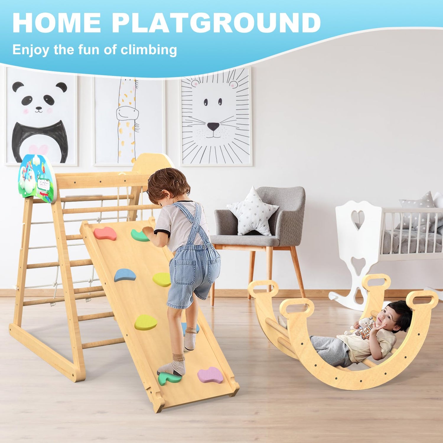 - [VERSATILE] The Pikler Climbing Set is a versatile toy that can be used as a jungle gym, a climbing net, an arch, a swing, and more, allowing for endless play possibilities.