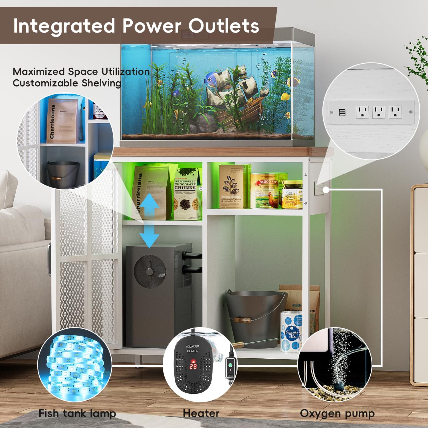 - Power the Tools & Accessories - Equipped with 2 USB ports and 3 power outlets at the side of the aquarium stand, it’s convenient to supply power for fish-farming tools and accessories like oxygen pump, heater, LED light strip...
