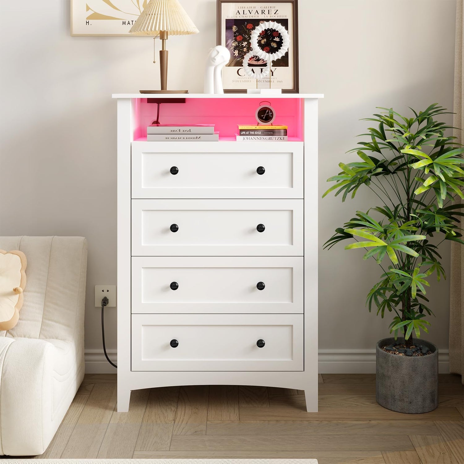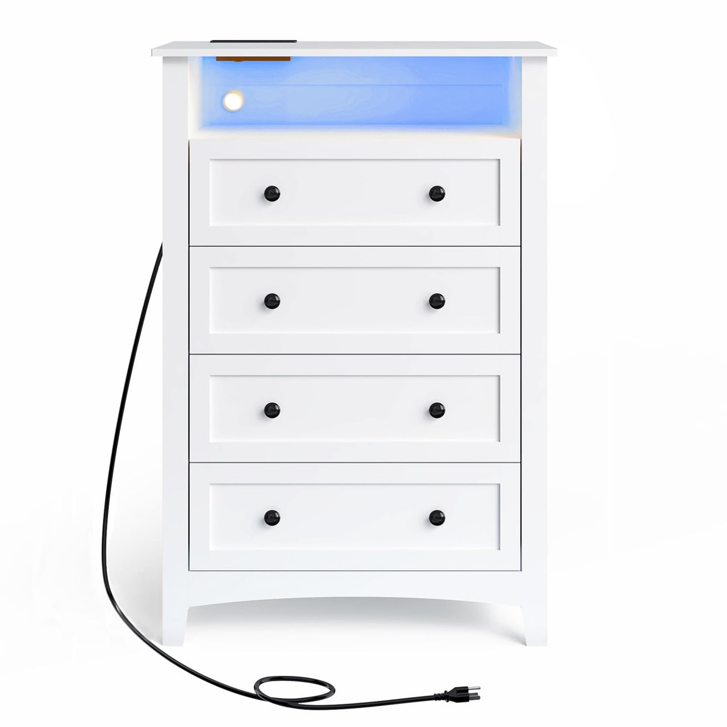 HAIOOU 4 Drawer Dresser with Open Storage Shelf, 47.4" Tall Chest of Drawers Vertical Wooden Clothing Organizer with Power Outlets and Ambiance Light for Bedroom, Closet, Hallway - Modern White