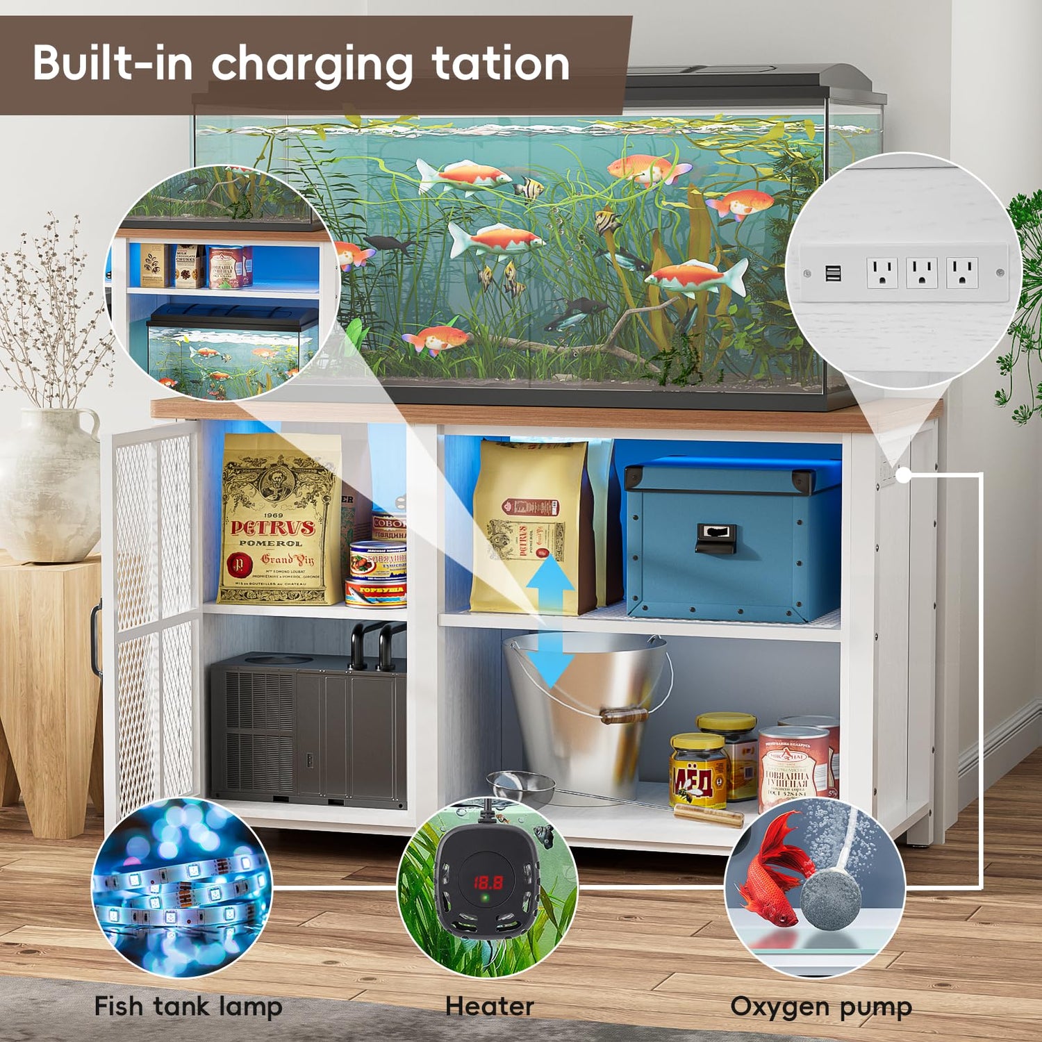 - Power the Tools & Accessories - Equipped with 2 USB ports and 3 power outlets at the side of the aquarium stand, it’s convenient to supply power for fish-farming tools and accessories like oxygen pump, heater, LED light strip...