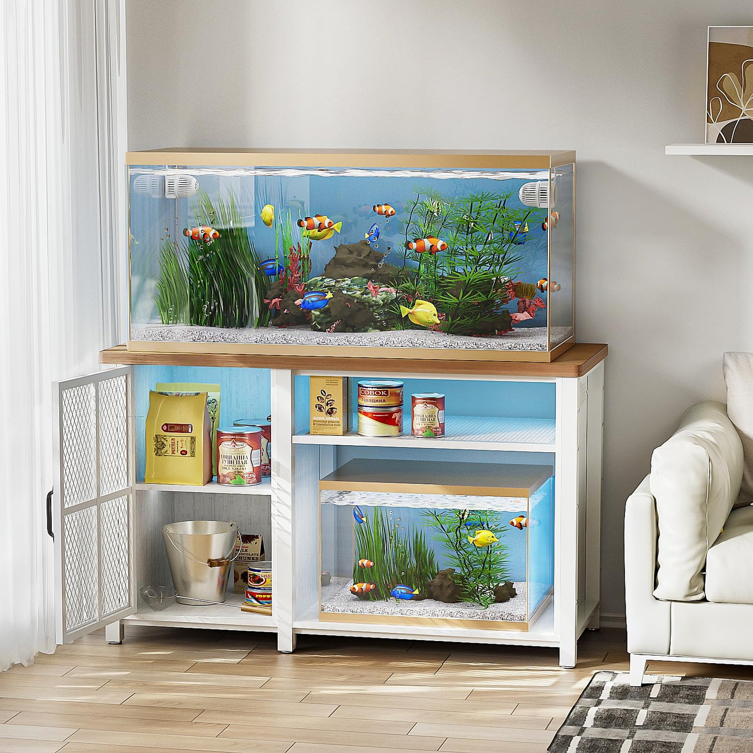 - Height Adjustable Shelves - The fish tank stand offers two height options for the mesh storage shelf. Fix the shelf at a higher level, it creates extended vertical space for accommodating an extra 20-gallon aquarium or reptile terrarium. Fix the shelf at middle level, it creates equal storage space up and down for ultimate organization of fish feed, aquarium accessories or sundries...