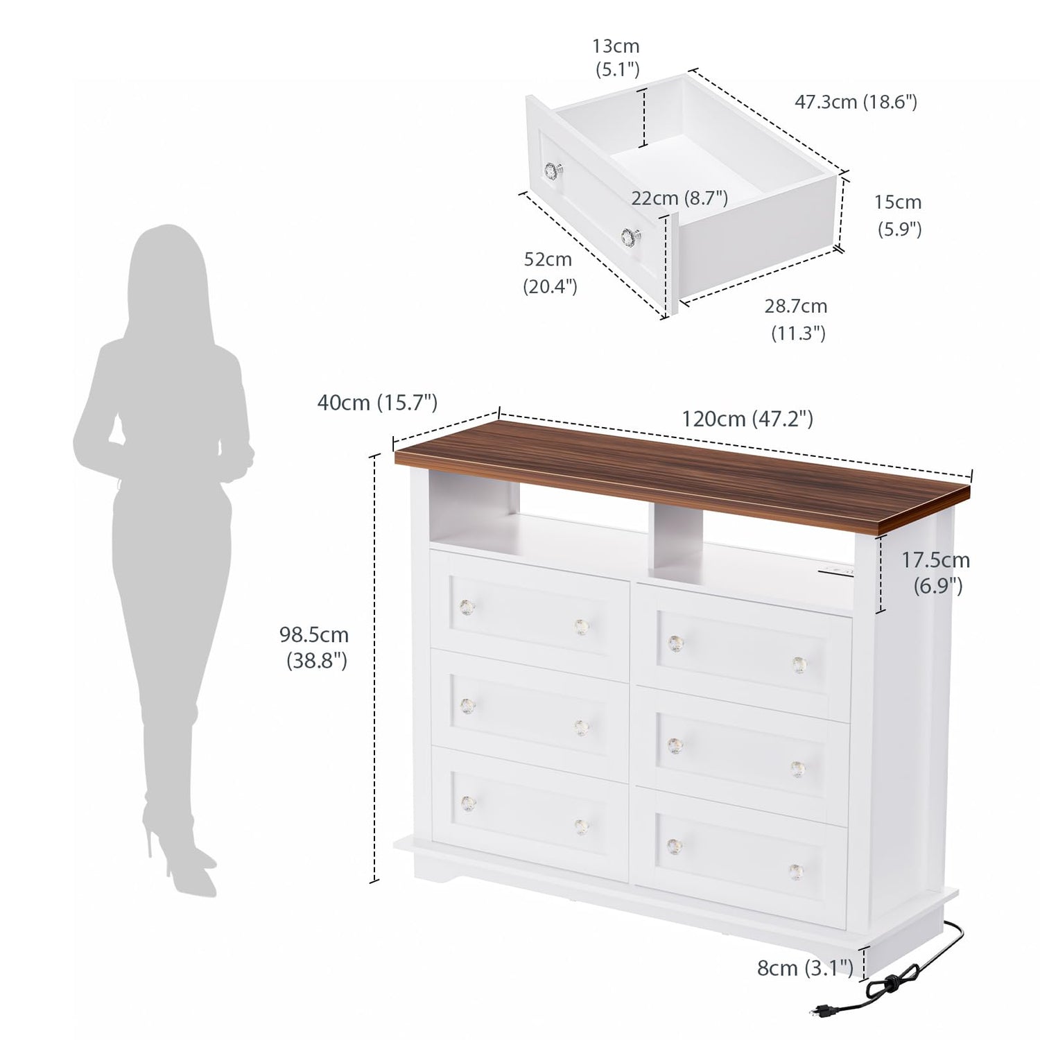 - Integrated Charging Hub: Elevate your lifestyle with a chest of drawers that doubles as a charging station. Conveniently located at the corner of the tabletop, it boasts 3 power outlets and 2 USB ports, enabling you to charge table lamps, smartphones, tablets, and other devices without the need for additional adapters. Seamlessly blend storage and functionality, all in one home deco stylish piece.