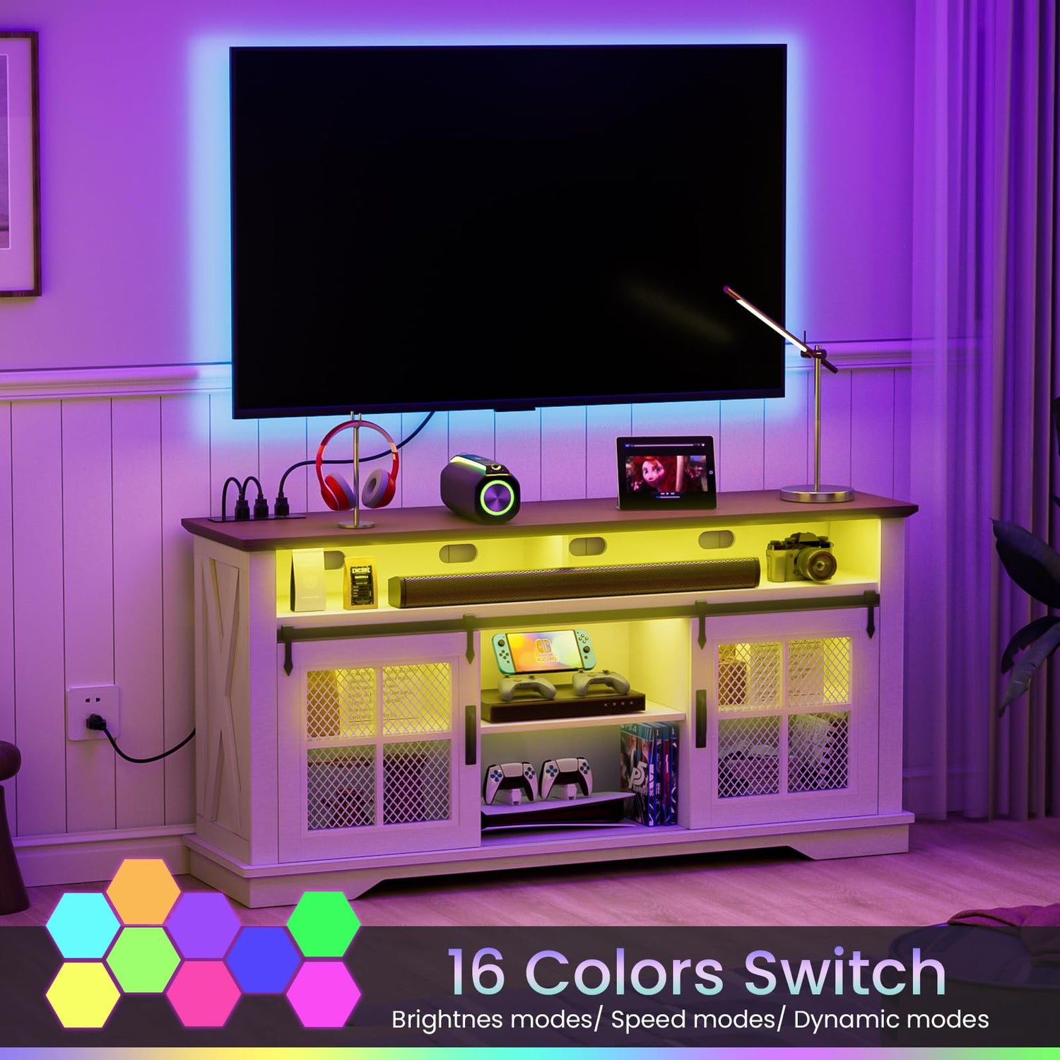 - đ„ăDouble-Deck Light Stripă - Unlike other basic TV tables, ours comes with a 1-divided-2 double-deck LED light strip, which can cover the whole inner space of cabinets. Multi-color and dynamic modes of the light creates cyber punk, or soothing, or immersive ambiance in your place, which is perfect for video game competitions, TV show viewing, festival celebration...