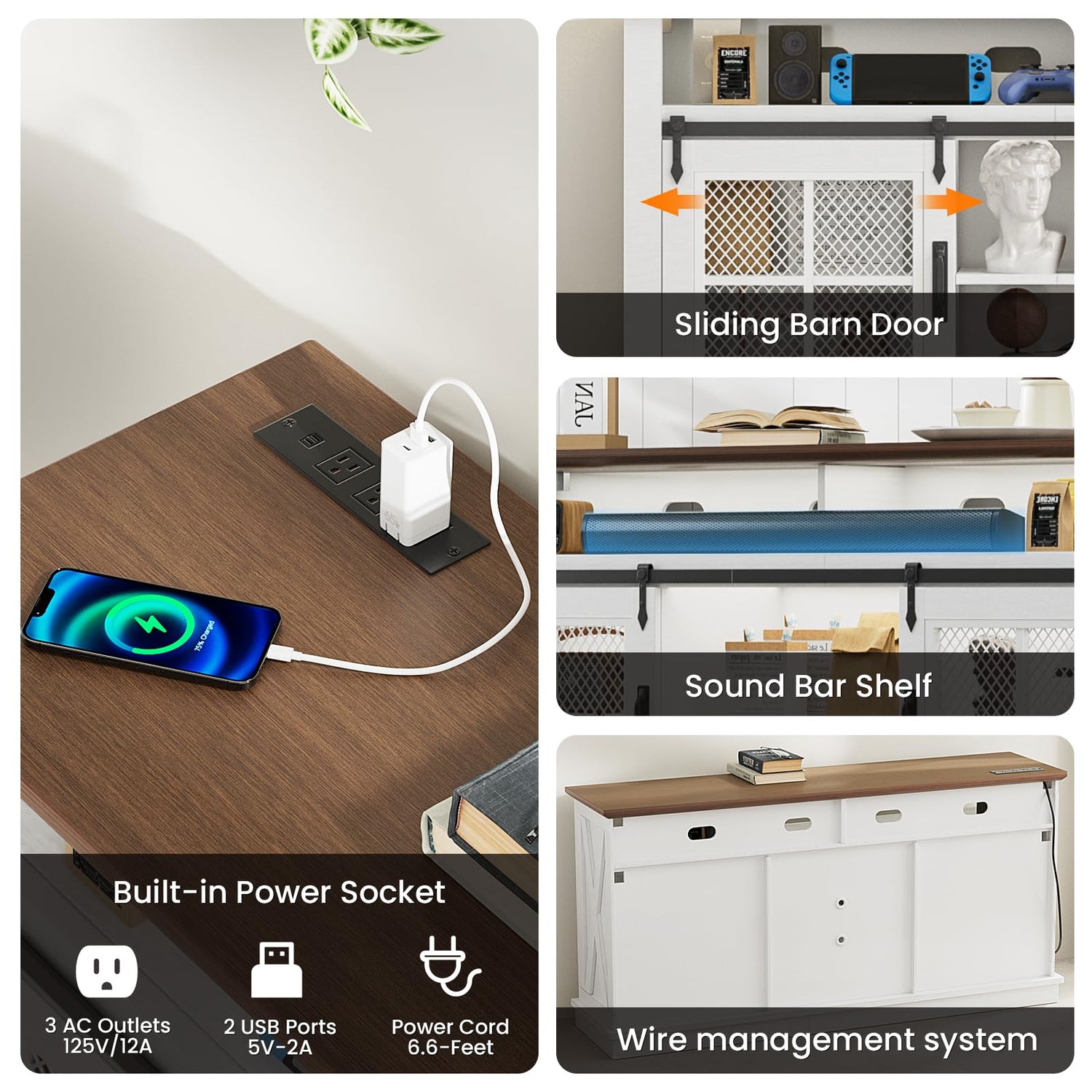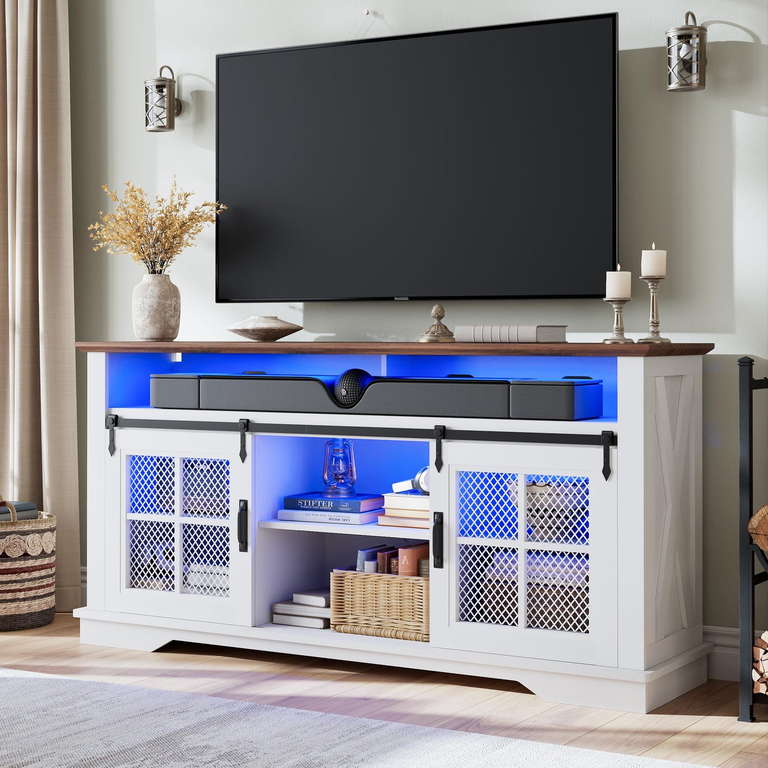 HAIOOU 63" Farmhouse TV Stand with LED Light & Power Outlets for TVs up to 70 Inches, 31.5" High Tallboy TV Console Stand Entertainment Center with Cross Design Sliding Barn Doors - White