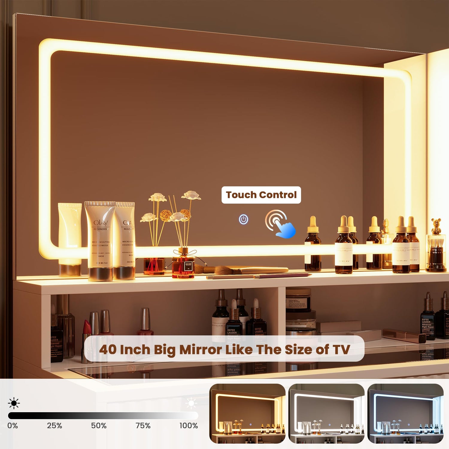 - 【36 Inch Large Size Mirror & Adjustable light】HAIOOU 48" white vanity desk with mirror and lights offers a super large mirror, LED light belt on the mirror, short press the switch to switch the light color: warm yellow, warm white, and cool white. Long pressing the switch to adjust the brightness according to different scenes and makeup needs