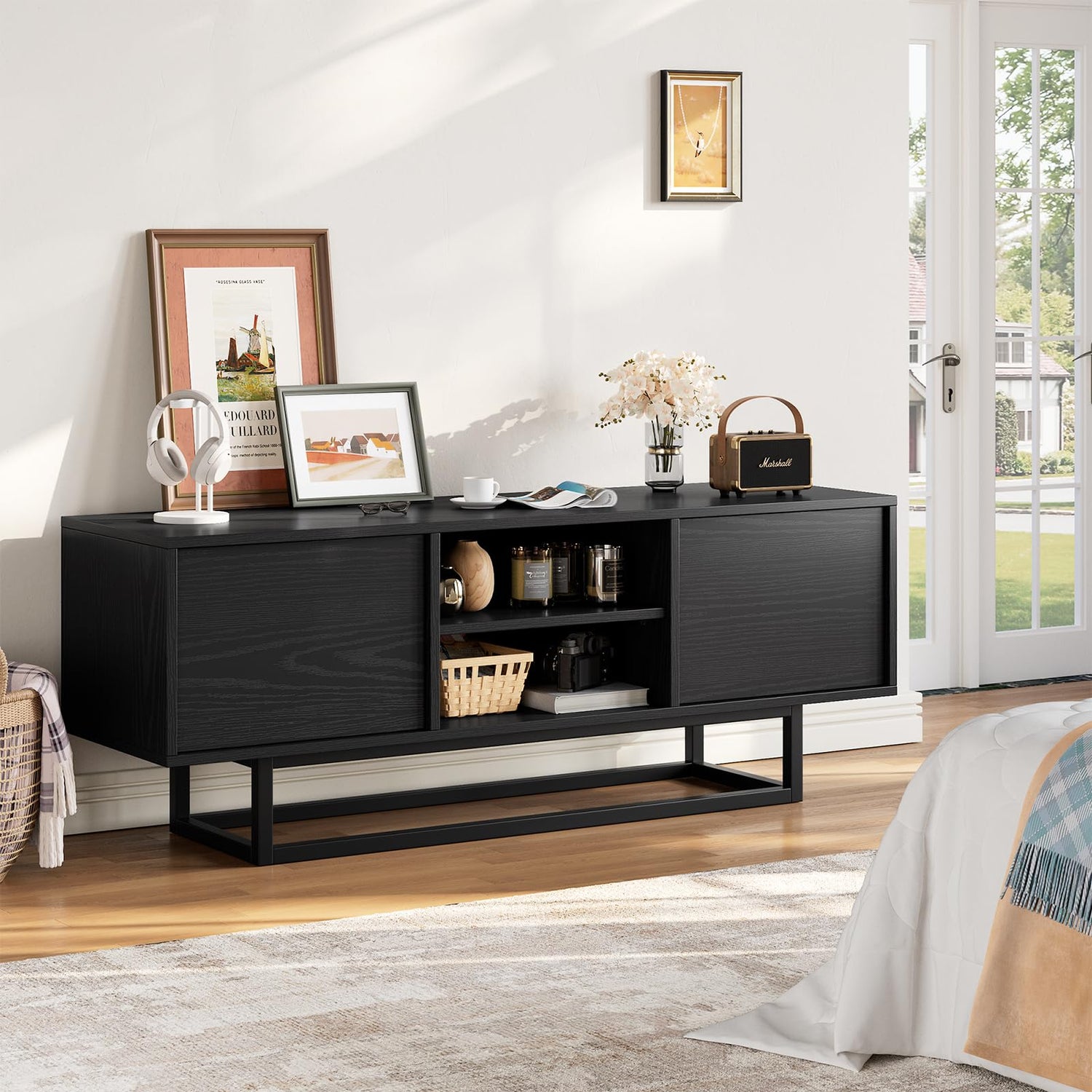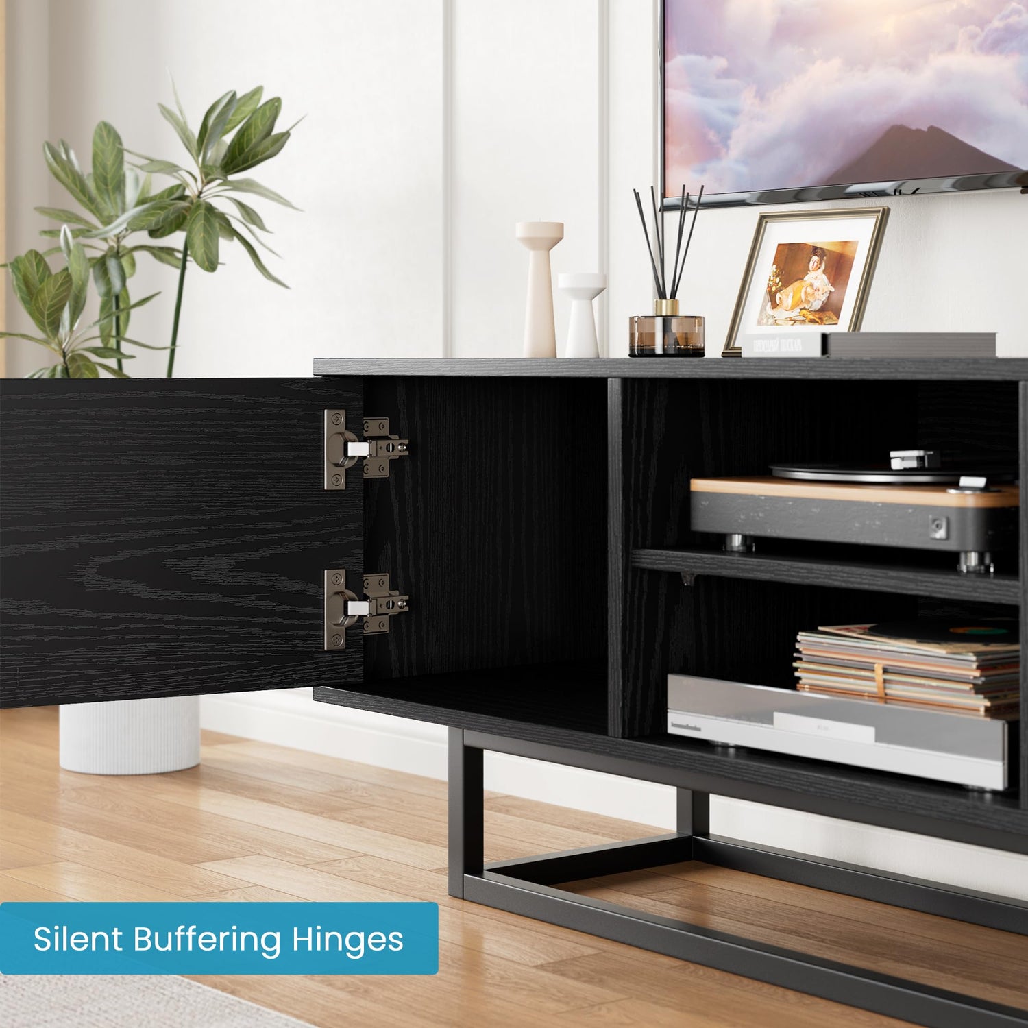 - Latest Collection - Searching for something different from the typical industrial TV stand with open shelves? Get tired of mid-century or farmhouse-style TV console? Explore our latest design - a sleek modern-industrial entertainment center, crafted with wood grain black finish and combines with wooden cabinet and robust metal frame base