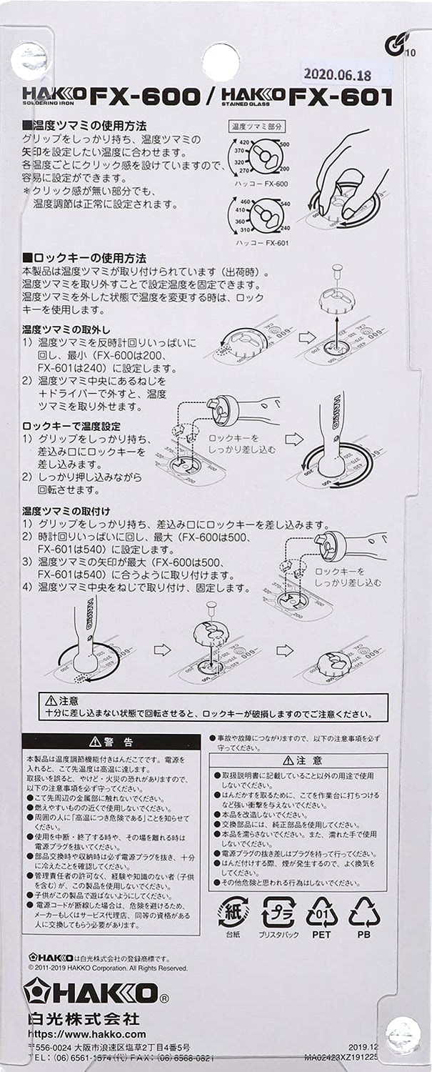 Details: Professional performance was condensed into one grip. Lightweight and quick heating is achieved. Built-in temperature controller in the grip, you can easily set the temperature from 200 to 500 degrees simply by turning the dial. You can easily adjust the optimum temperature according to your work. More than 30 types of replacement tip. To the high heat capacity soldering iron with the optional tip. Package size / length: 270 mm, width: 110 mm, height: 35 mm, package weight: 180 g. Producing country: Malaysia. Application: Temperature control soldering iron. Total length: 205 mm. Mass: 61 g. Settable temperature: 200 to 500 degrees. Grip: Built-in temperature controller. Tip tip: T18 - B (length 14.5 mm ? tip R 0.5). Available materials: IC ? LED, printed circuit board, electronic work, audio ? AV equipment, model, radio control. HAKKO Corporation is the globally recognized company in soldering products with proven solutions that go beyond what is expected. Dedicated to meeting the ever- growing demands for soldering, HAKKO takes pride in our people and our products. In fact, the essence of the HAKKO culture is to help connect valuable components with soldering. With more than a half-centuryfs experience in soldering technology, HAKKO Corporation is able to anticipate their clientsf needs, exceed their expectations, and deliver the best soldering for all kinds of parts and products in a range of environments. Innovation, creativity, sincerity and a shared sense of excitement allow us to move seamlessly from product design to global marketing to sales without sacrificing the needs of each individual client. When it comes to soldering technology, ask HAKKO.