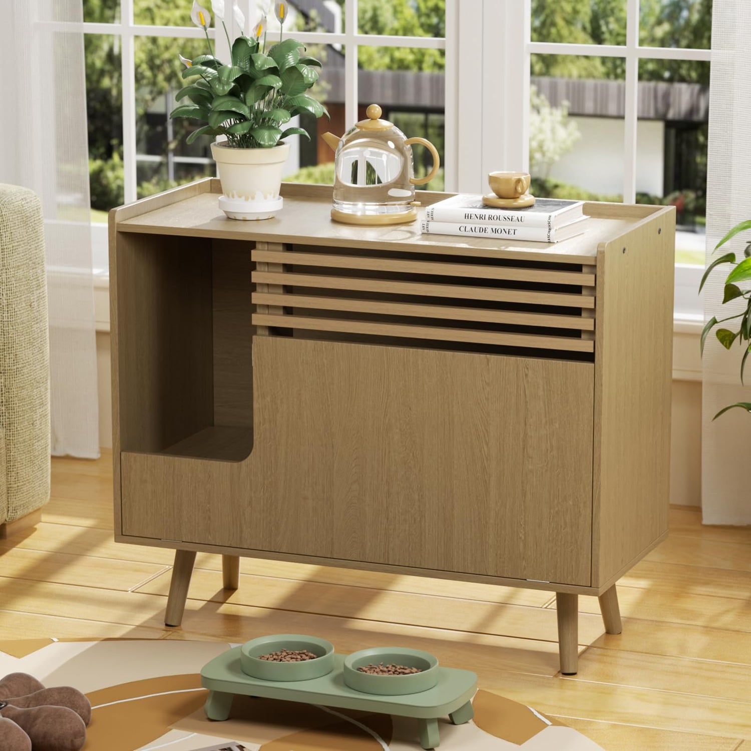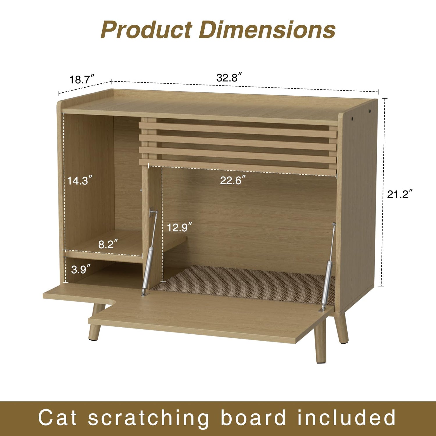 Halitaa Cat Litter Box Enclosure,Mid-Century Modern Hidden Litter Box Furniture with Cat Scratch Pad,Flip-Down Opening Litter Box Cabinet Cat Washroom End Table,Natural