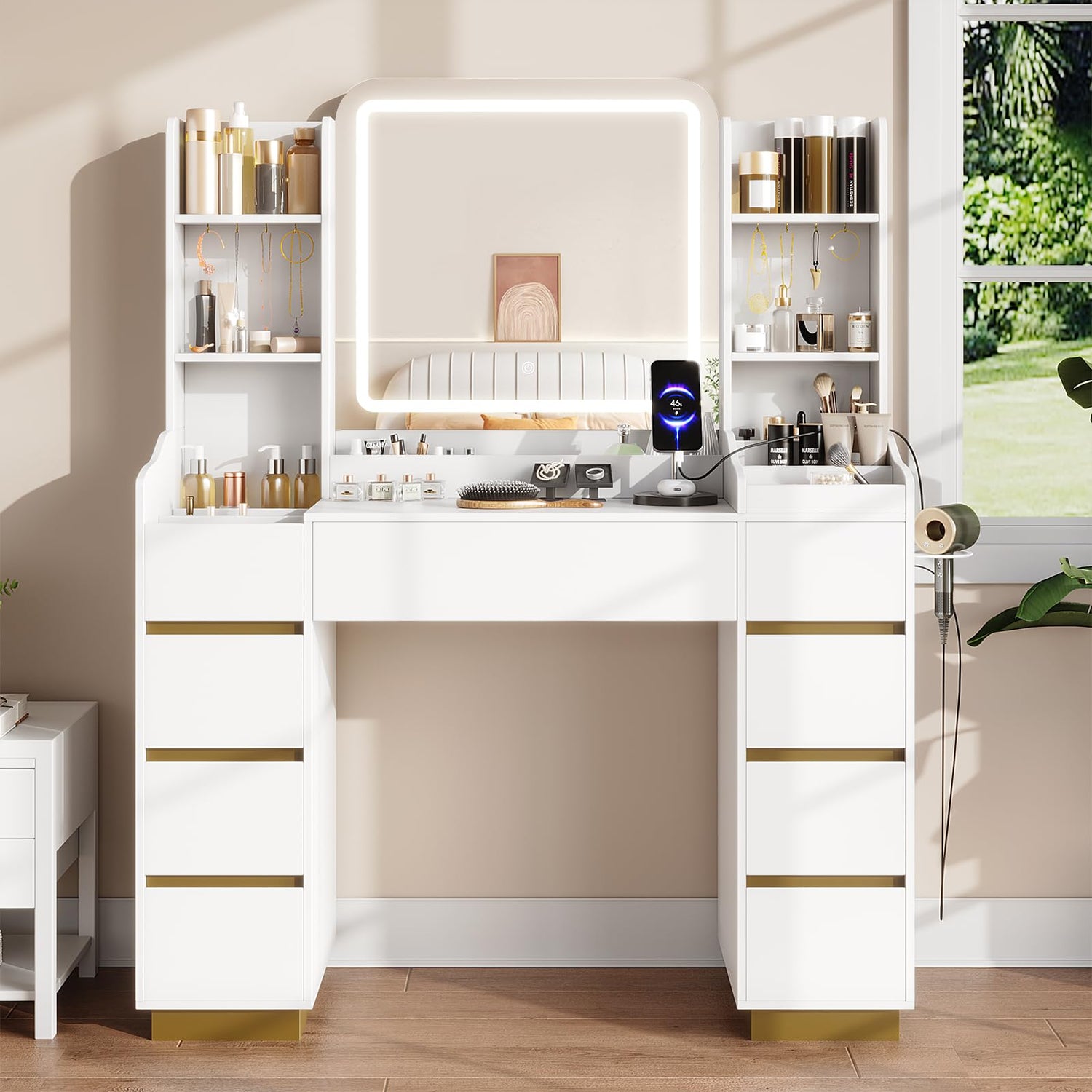 Halitaa Large White Vanity with Lighted Mirror,3 Lighting Modes, 9 Drawers Gold Accent Makeup Vanity Table with Charging Station and 4 Shelves