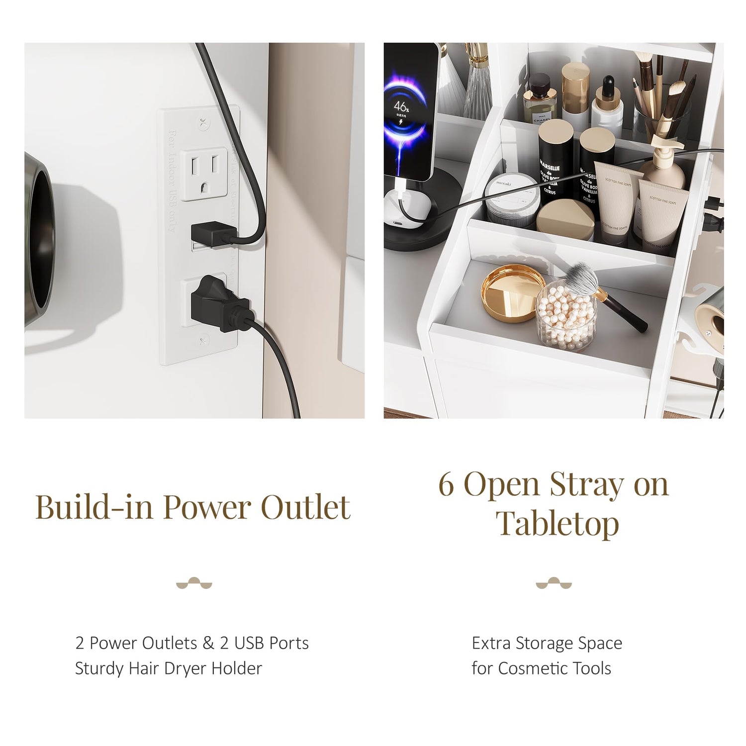 - Power Outlet & Easy Assembly: White vanity desk with a power outlet and hair dryer rack, So you can sit in front of your dresser and use your hair dryer, curling iron, and charge your phone or tablet. Vanity desk with lights very easy to assemble following the step-by-step instructions