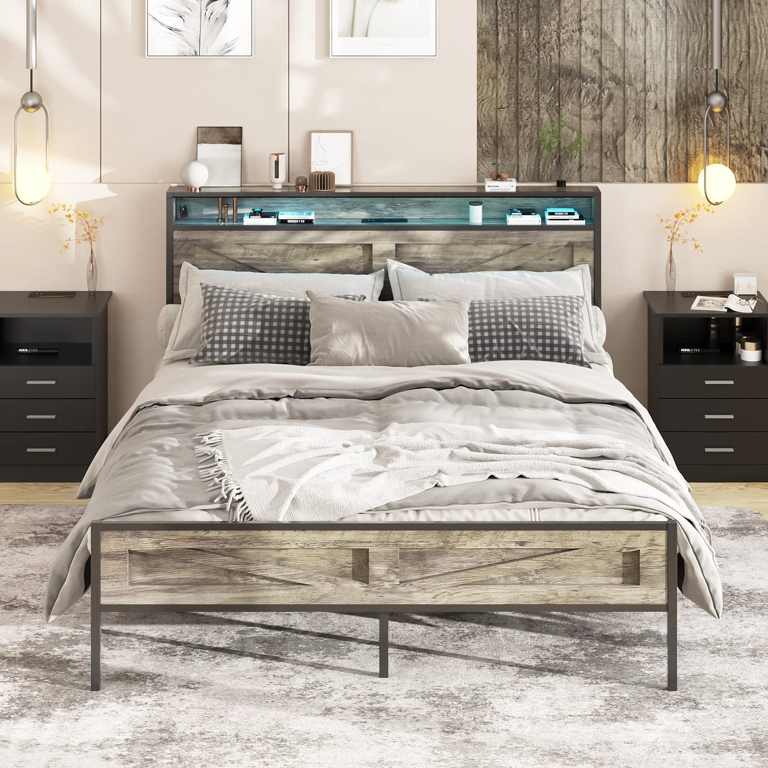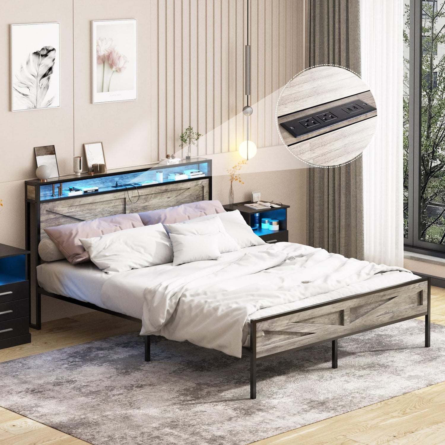 Halitaa King Size LED Bed Frame with Charging Station and Storage - Wash Grey