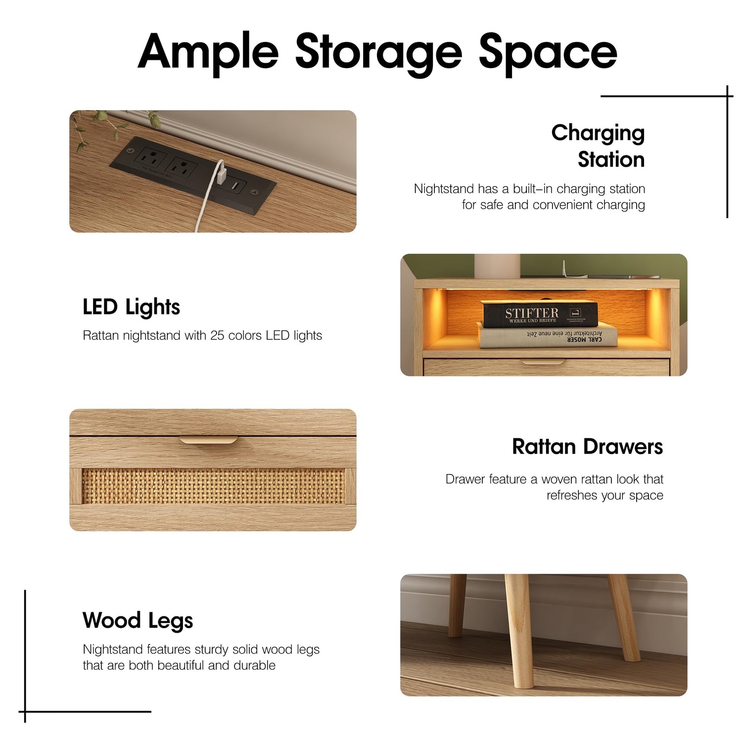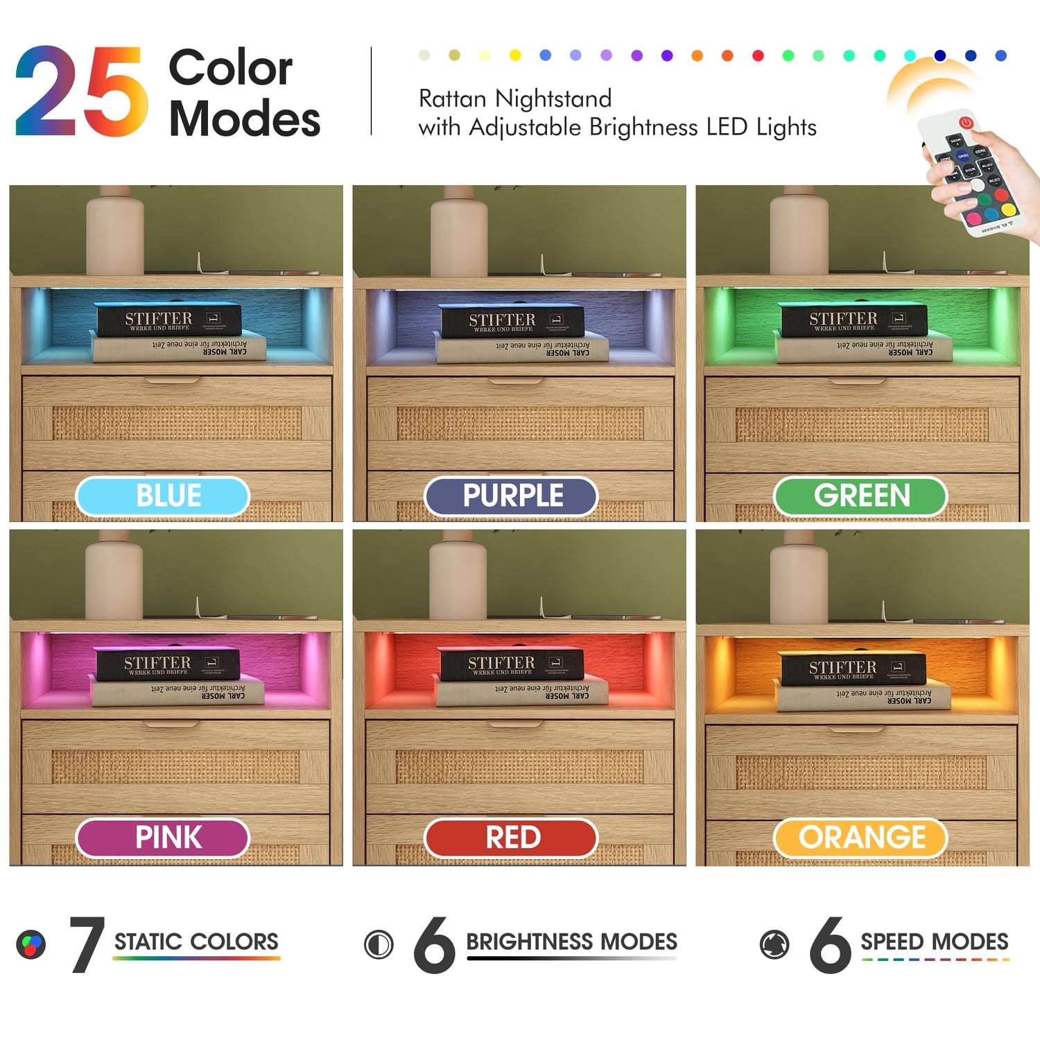 - 【Aesthetic Furniture】Combining classic and modern styles, this light oak-toned bedside table with rattan-decorated drawers exudes a natural bohemian vibe. The hand-woven rattan and light luxury metal handle bring a perfect visual effect, and the LED light strips with 25 color modes, 6 speed modes, and 6 brightness modes add color to your life.