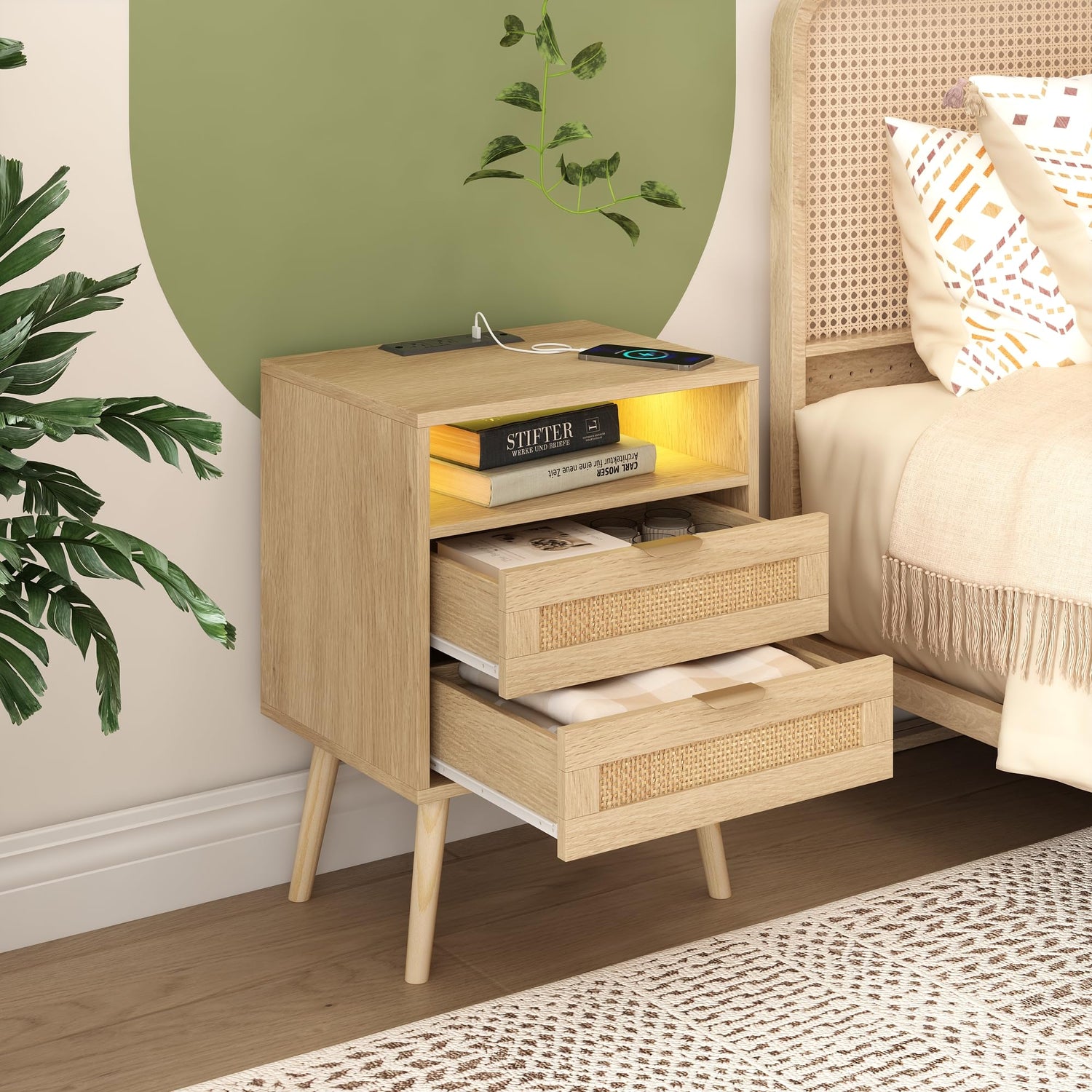 Halitaa Rattan Nightstands Set of 2 with Charging Station and Led Lights, End Tables with 2 Drawers and Wood Legs, Bedside Tables Night Stands for Bedrooms, Side Tables Living Room (2 Pack)